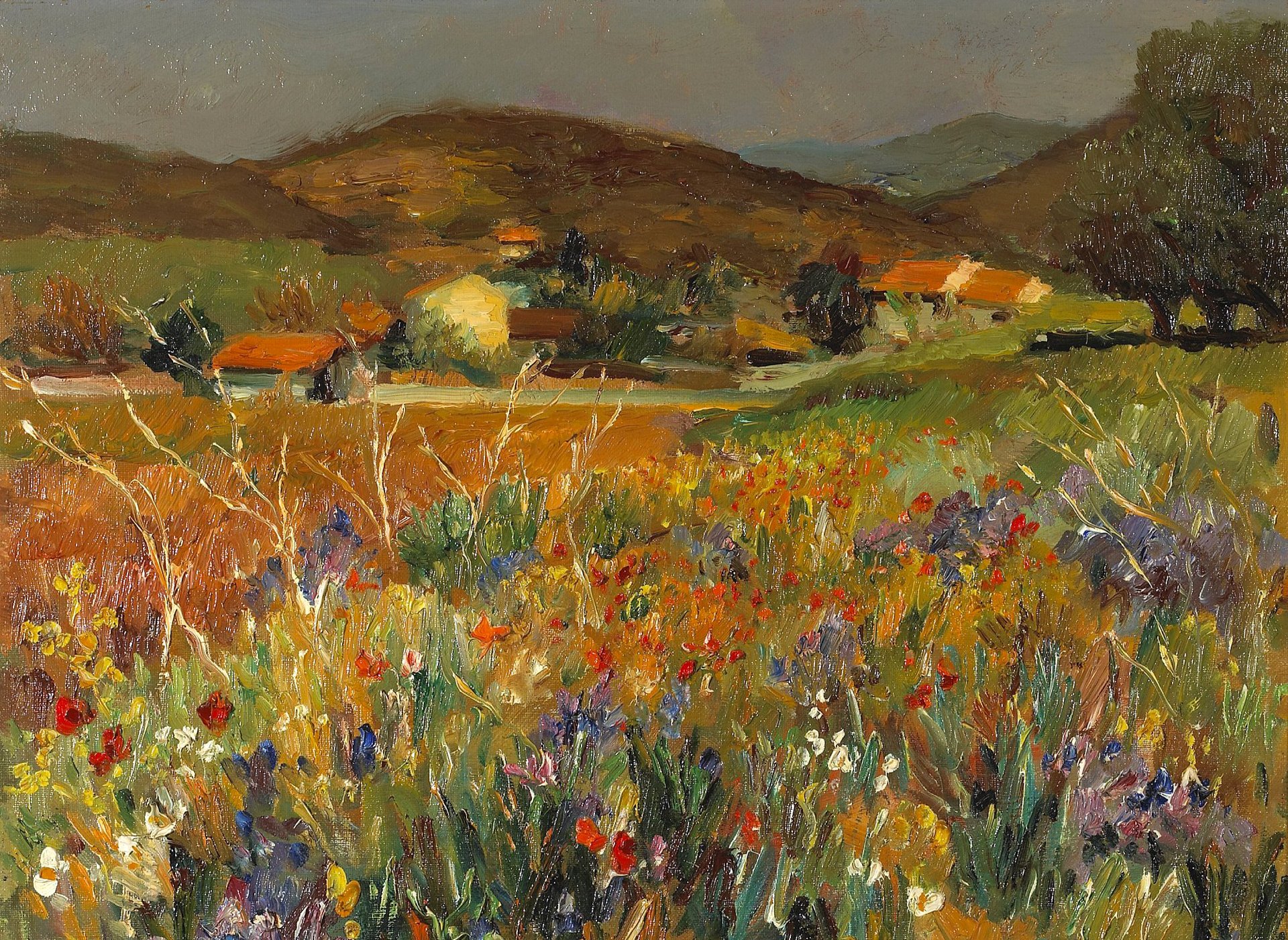 Paysage à l'huile de Marcel dief champ de fleurs en Provence