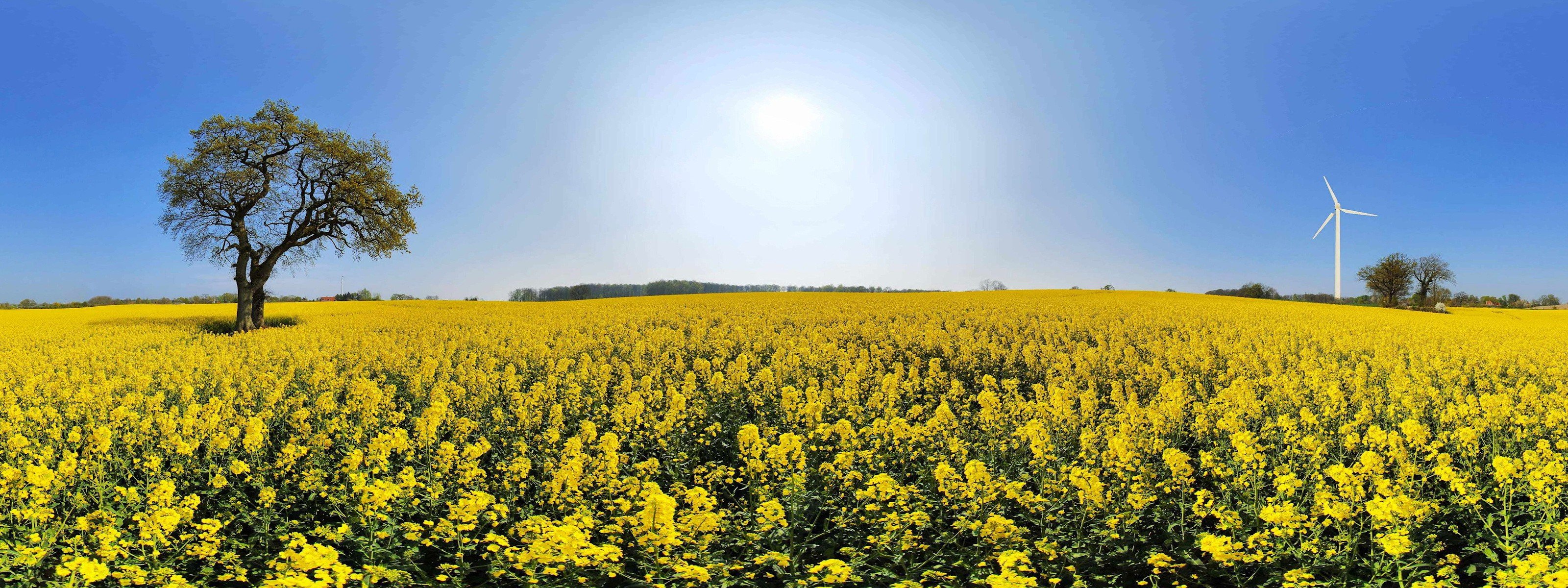 Moulin à vent solitaire et arbre solitaire dans un champ de fleurs jauneMoulin à vent solitaire et arbre solitaire dans un champ de fleurs jaune