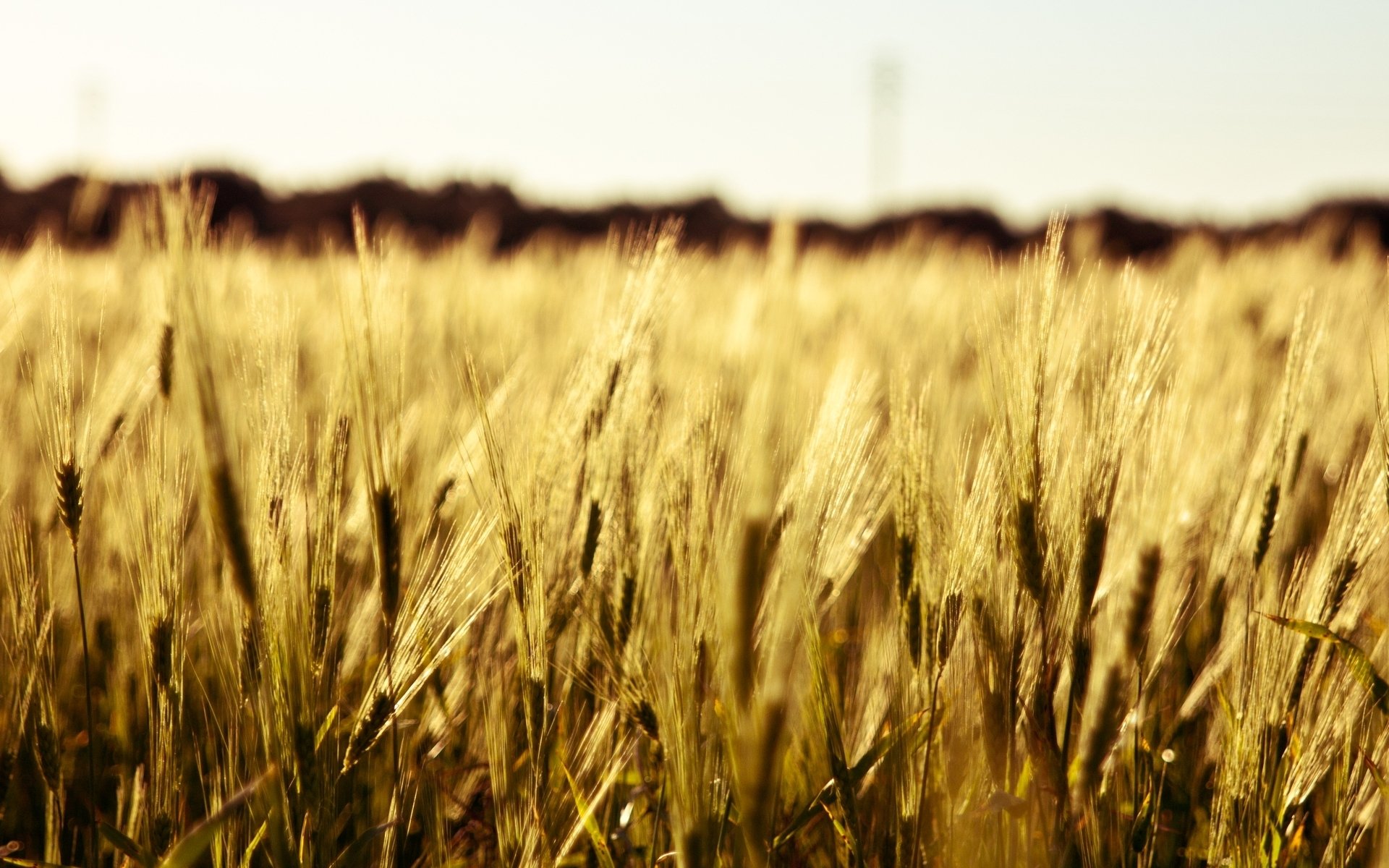 Gros plan de champ de blé de couleur jaune sur fond de mer bleu vif sous le soleil d'été