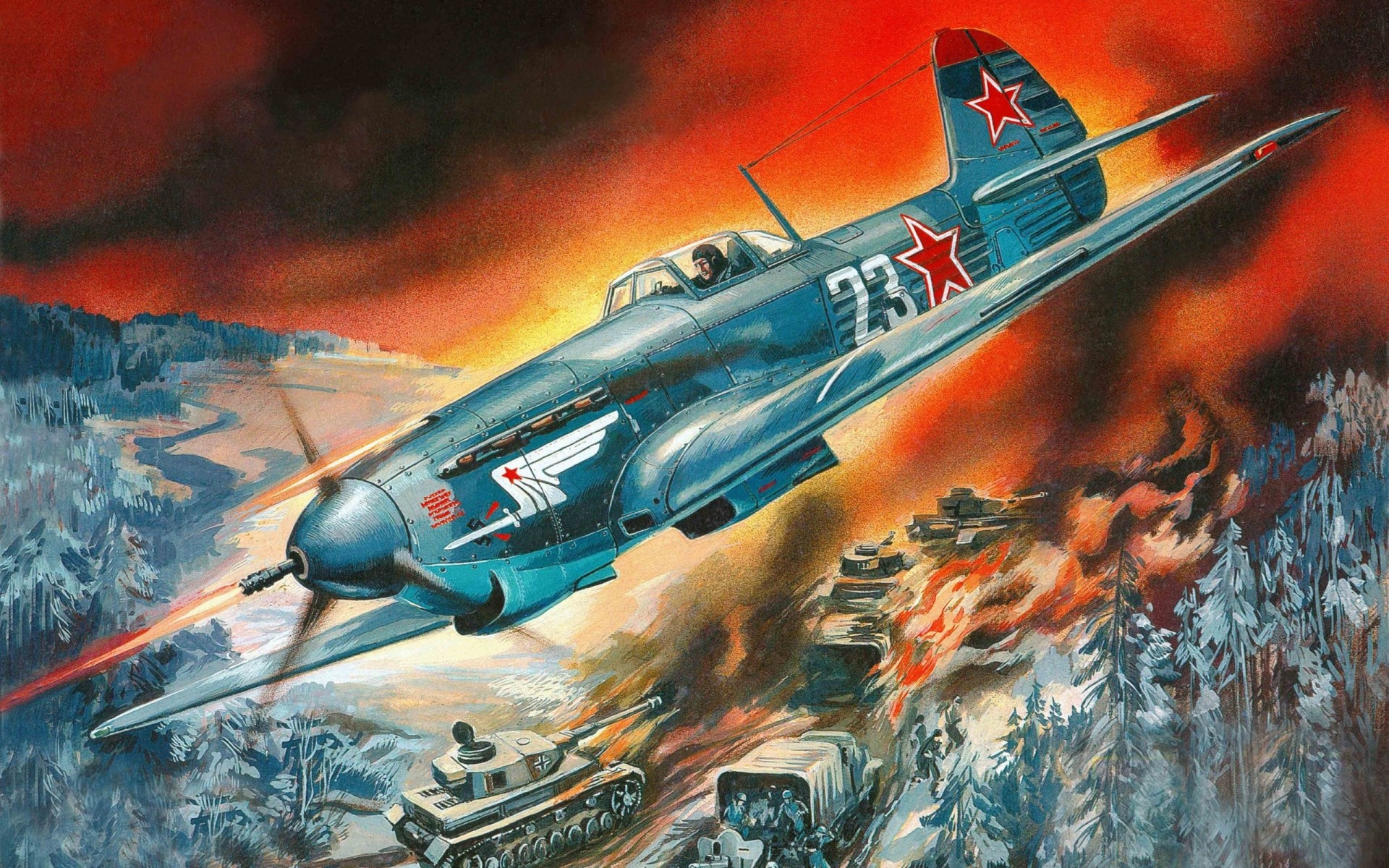 Un chasseur monomoteur dans le ciel attaque des chars allemands