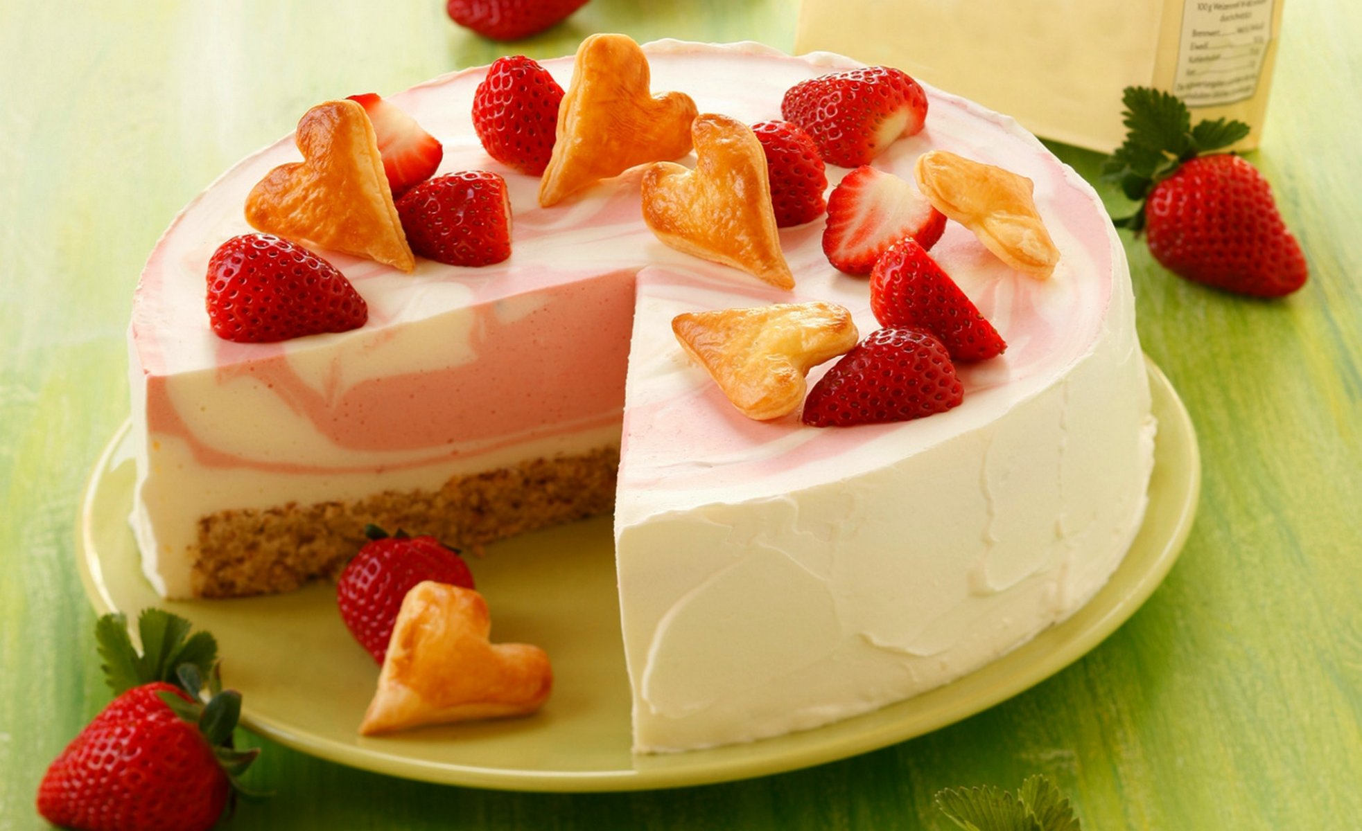 Cheesecake aux fraises sur une assiette verte