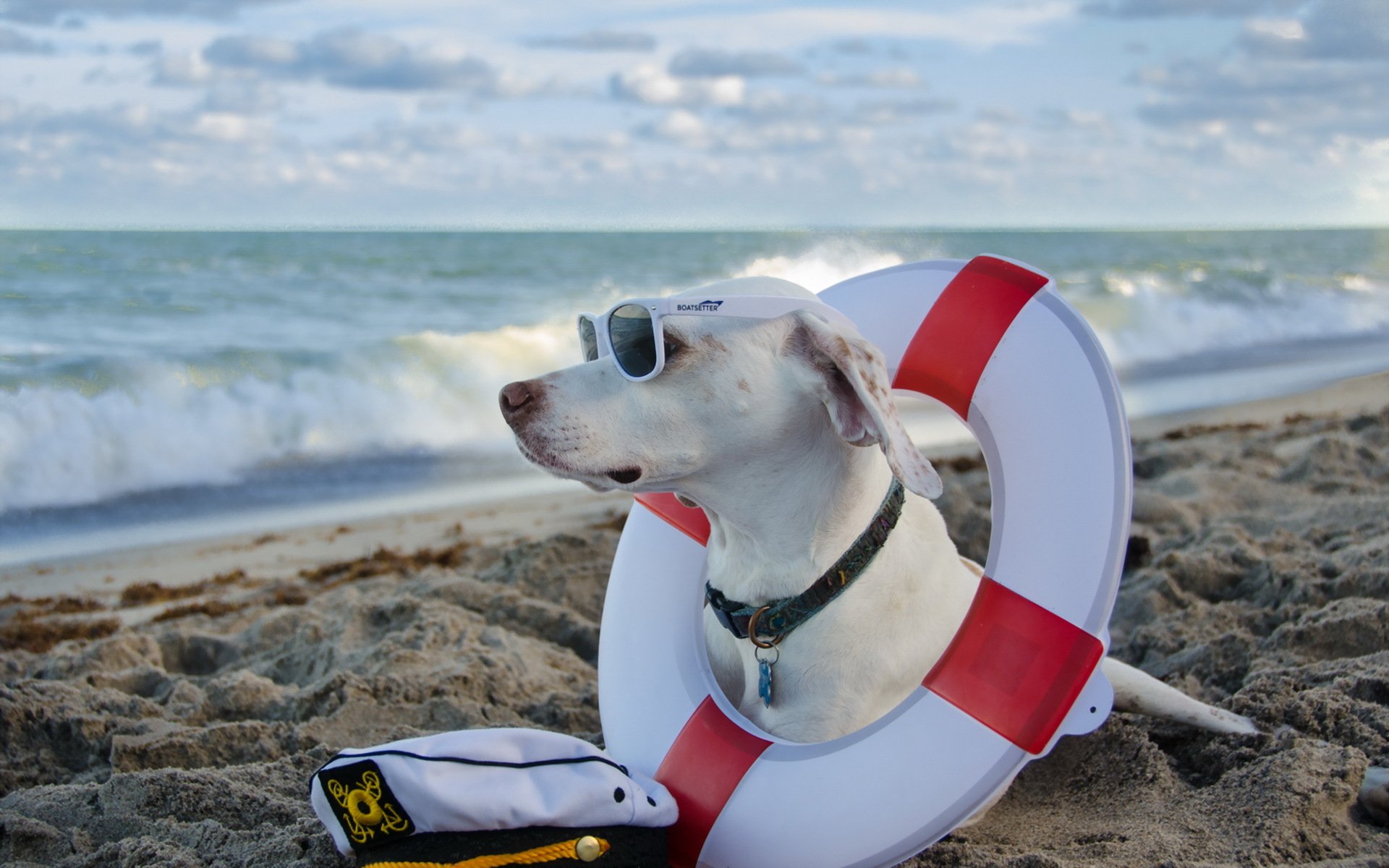 Chien à lunettes sur la mer