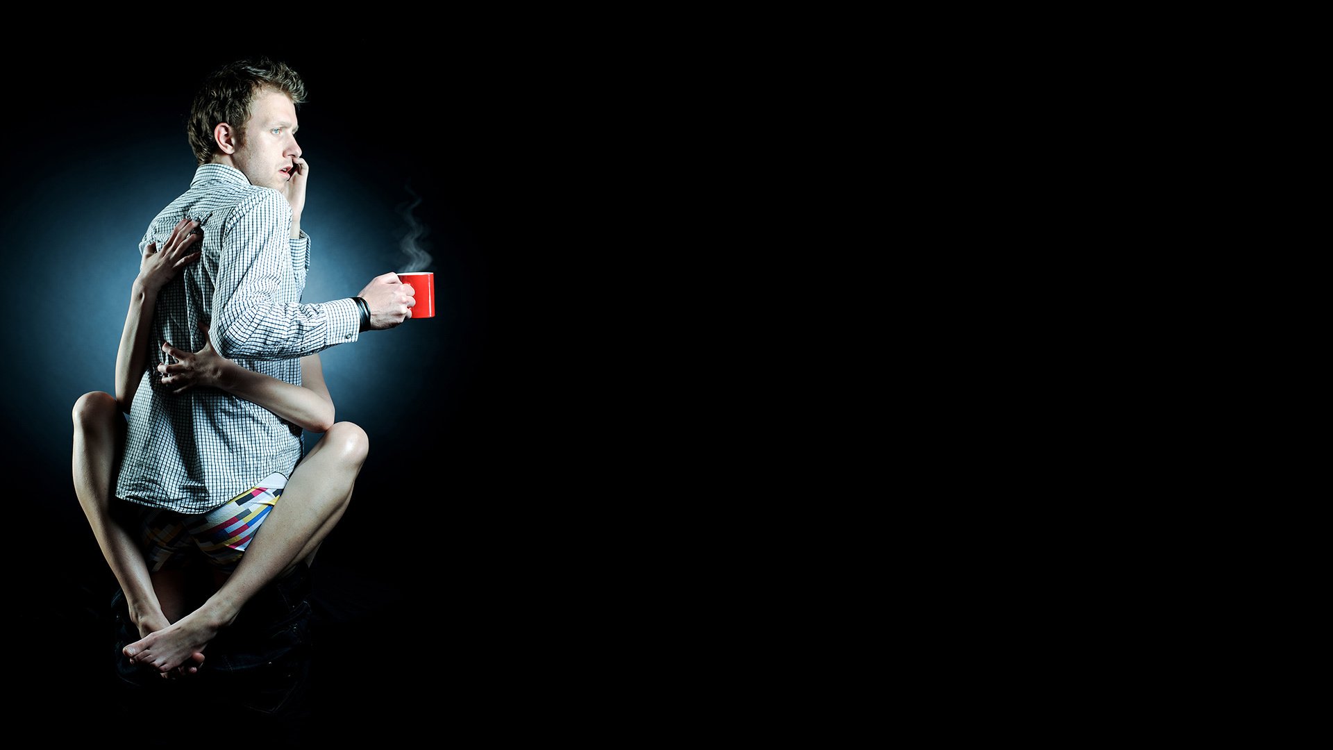 Homme avec téléphone et café dans les bras d'une femme