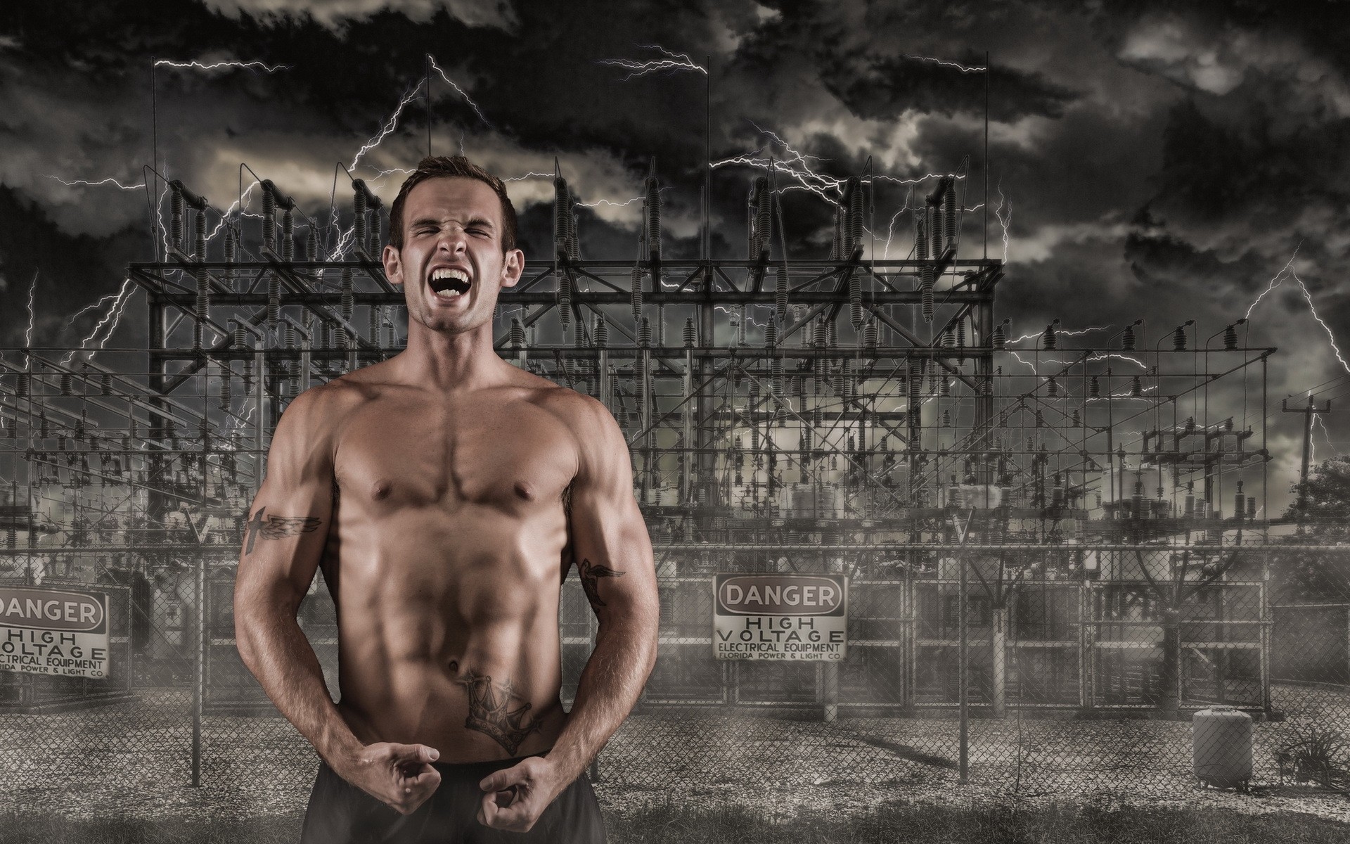 Un homme avec un torse nu tient une chaîne dans ses mains