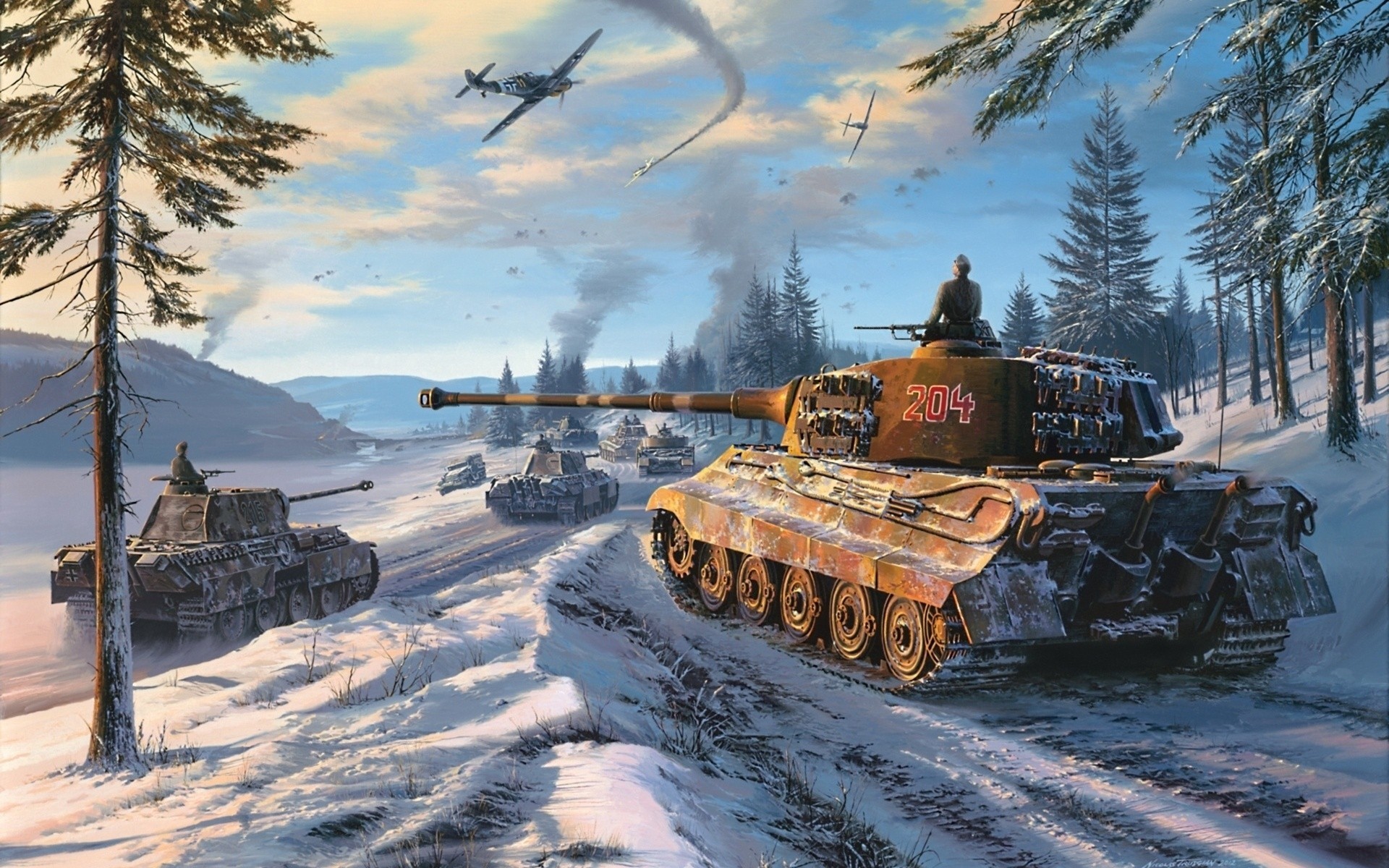 Colonne de chars dans la forêt d'hiver. peintures sur la seconde guerre mondialeColonne de chars dans la forêt d'hiver. Peintures sur la Seconde guerre Mondiale