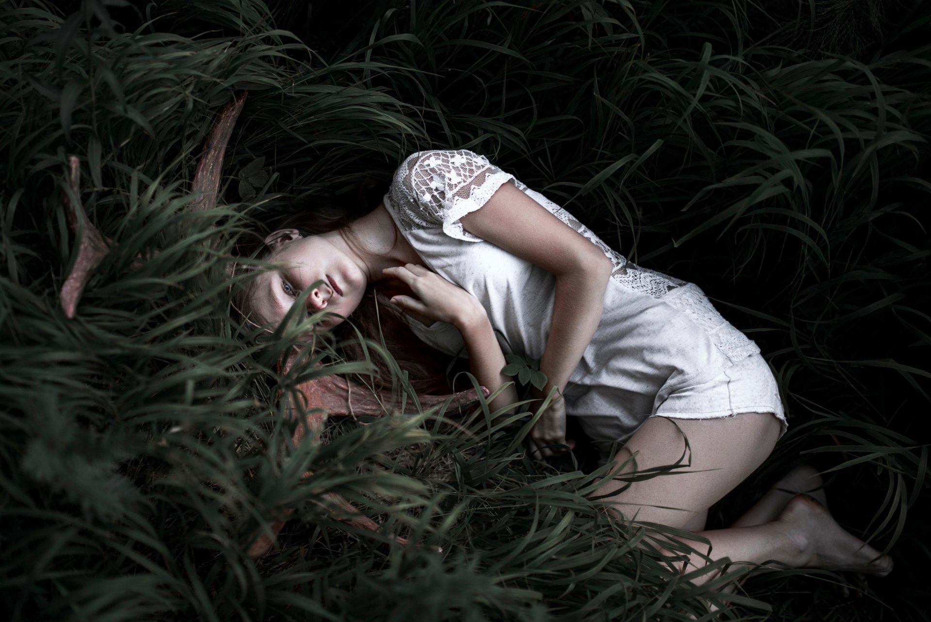 Jeune fille se trouve les yeux fermés dans l'herbe