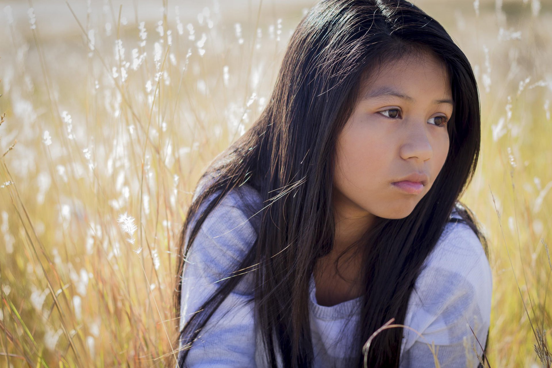 Fille aux cheveux noirs dans le profil sur fond sombre