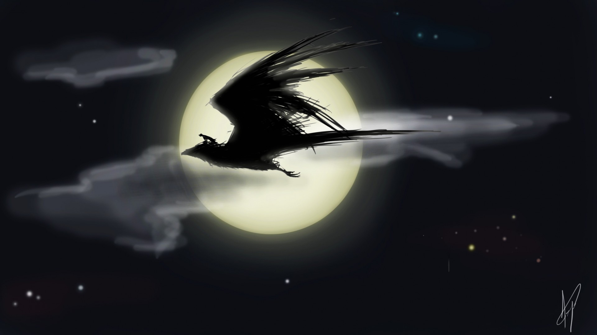 Cavalier sur un oiseau dans la nuit sur fond de luneCavalier sur un oiseau dans la nuit sur fond de lune