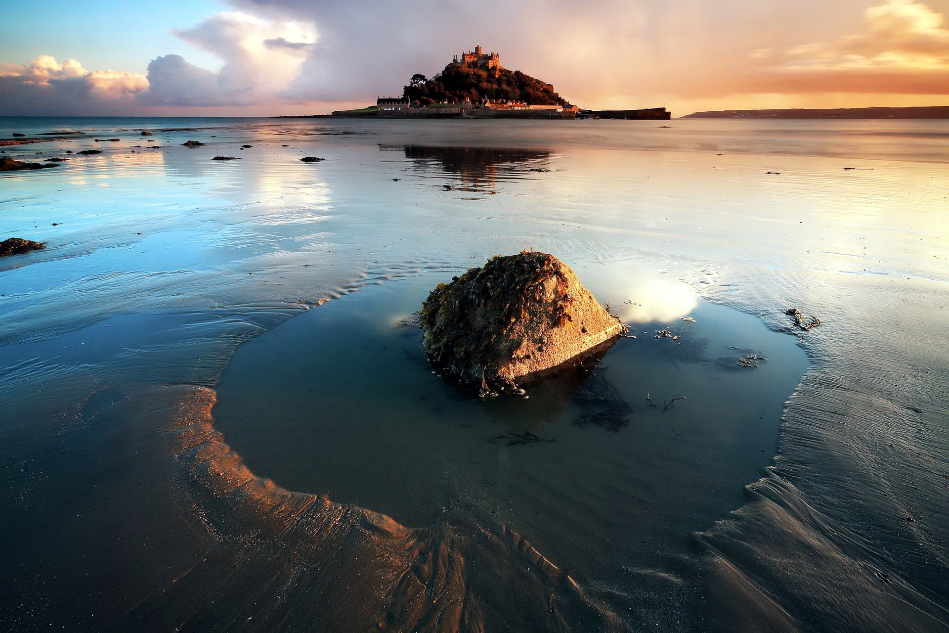 Rocher solitaire dans la mer sur fond de lever de soleilRocher solitaire dans la mer sur fond de lever de soleil