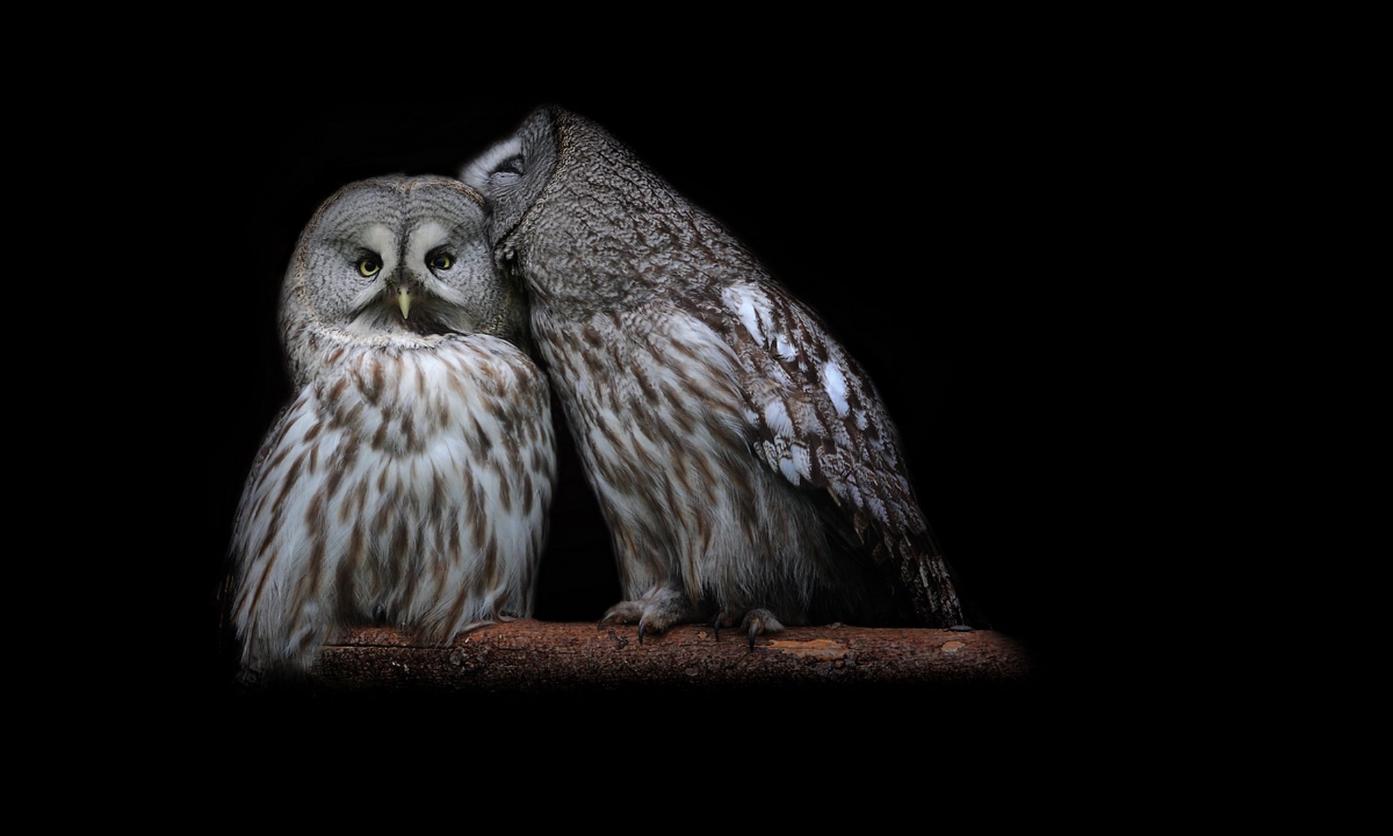Deux hiboux sur fond noir prennent soin les uns des autresDeux hiboux sur fond noir prennent soin les uns des autres