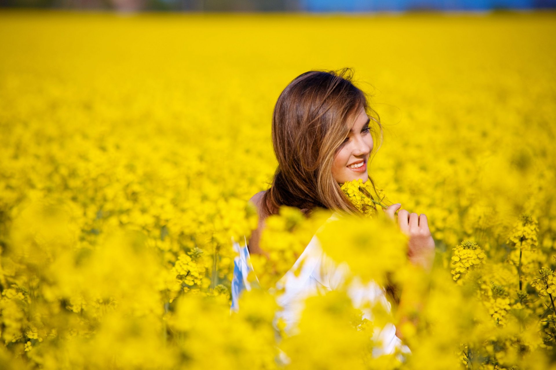 Jeune fille souriante sur le terrain avec des pissenlitsJeune fille souriante sur le terrain avec des pissenlits
