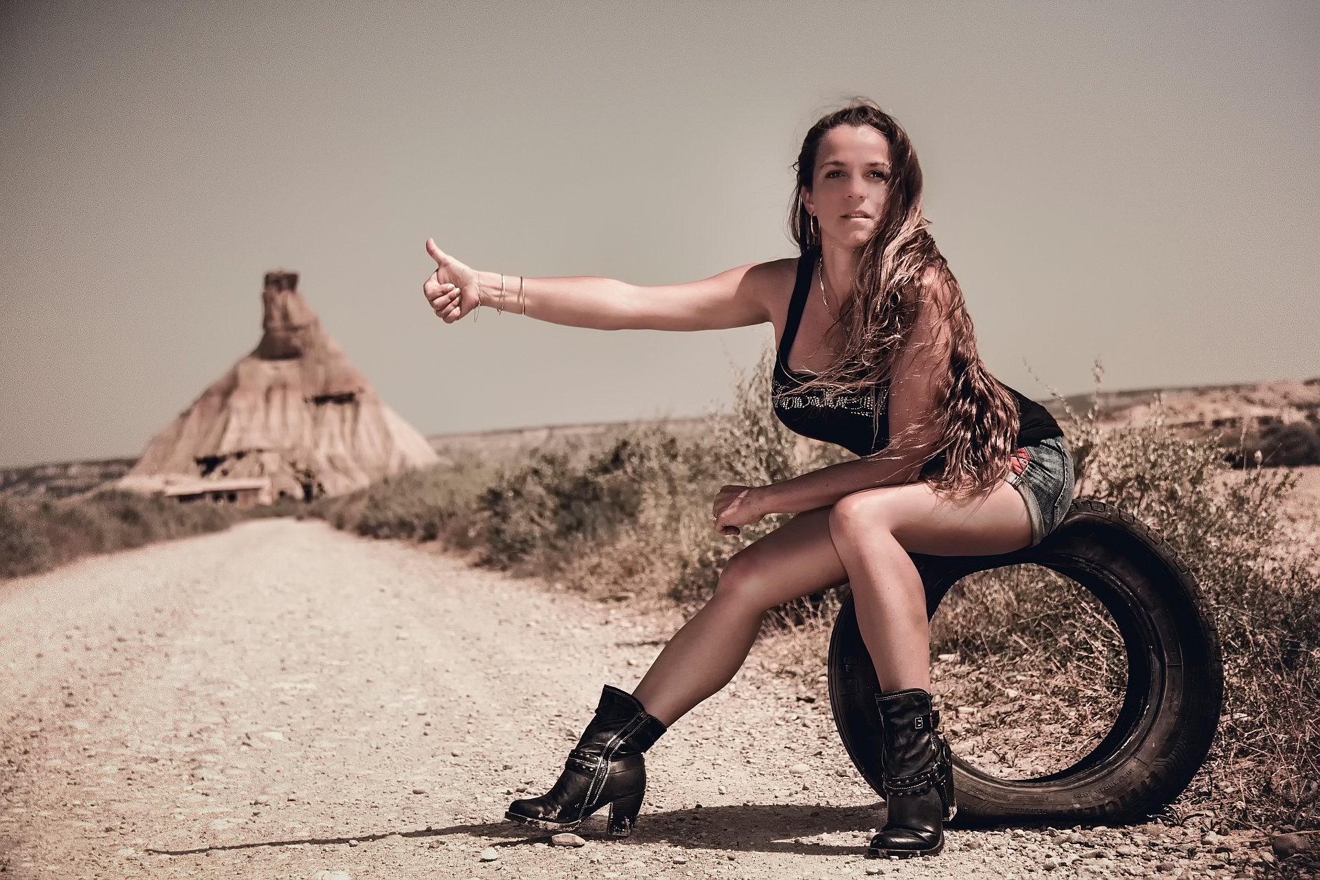 La jeune fille est assise sur un pneu à côté de la route et voteLa jeune fille est assise sur un pneu à côté de la route et vote