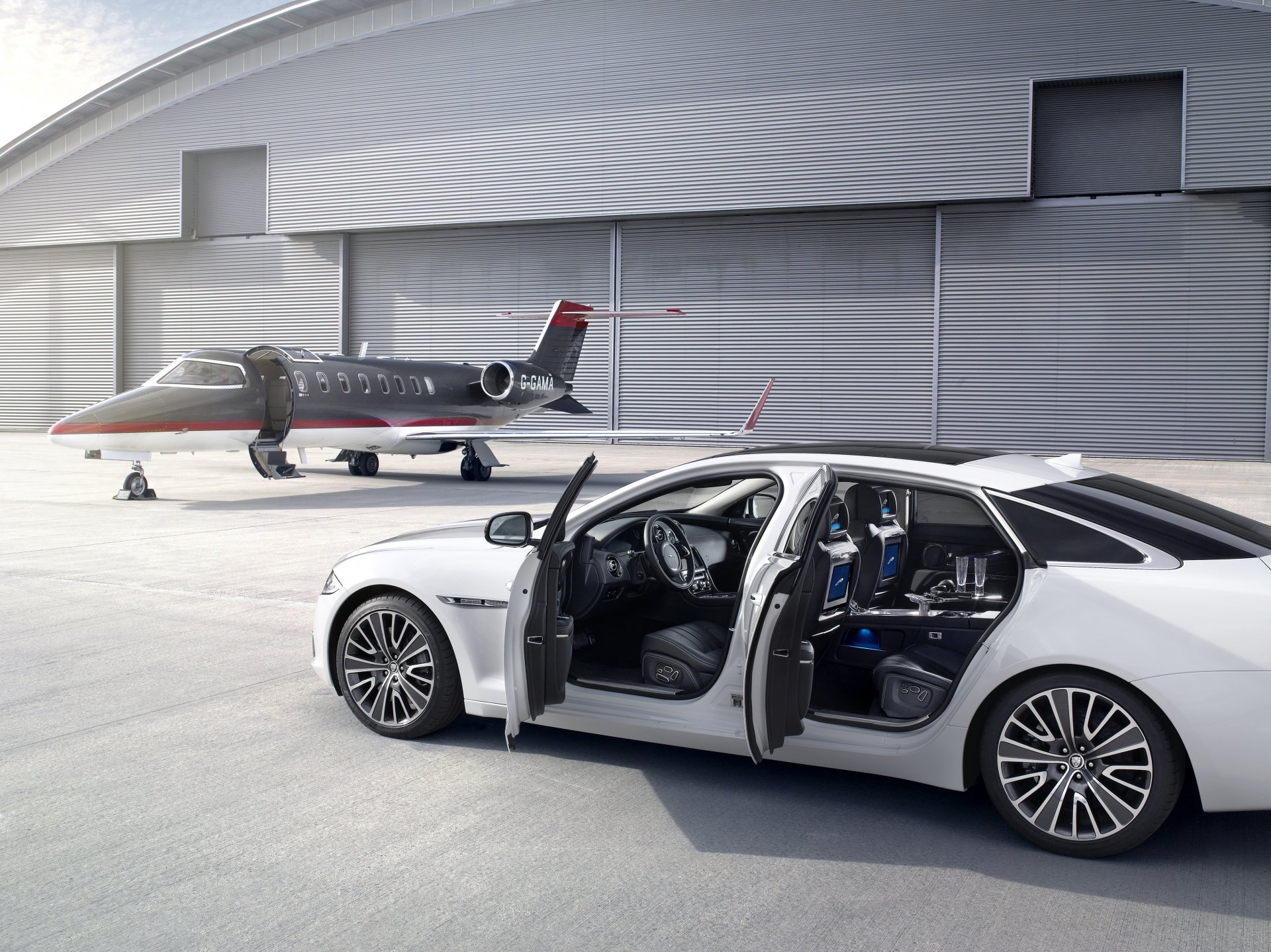 Jaguar blanc sur fond d'avion avec portes ouvertesJaguar blanc sur fond d'avion avec portes ouvertes