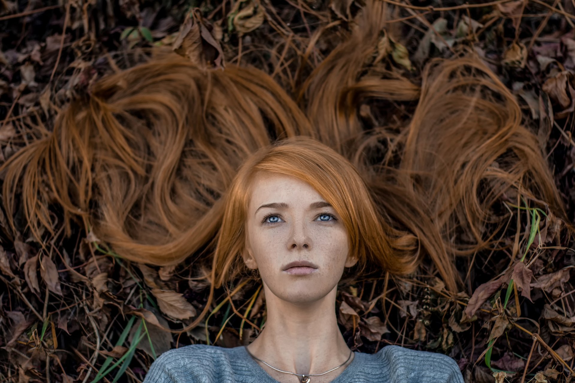 Portrait d'une jeune fille aux cheveux roux sur fond de feuilles mortesPortrait d'une jeune fille aux cheveux roux sur fond de feuilles mortes