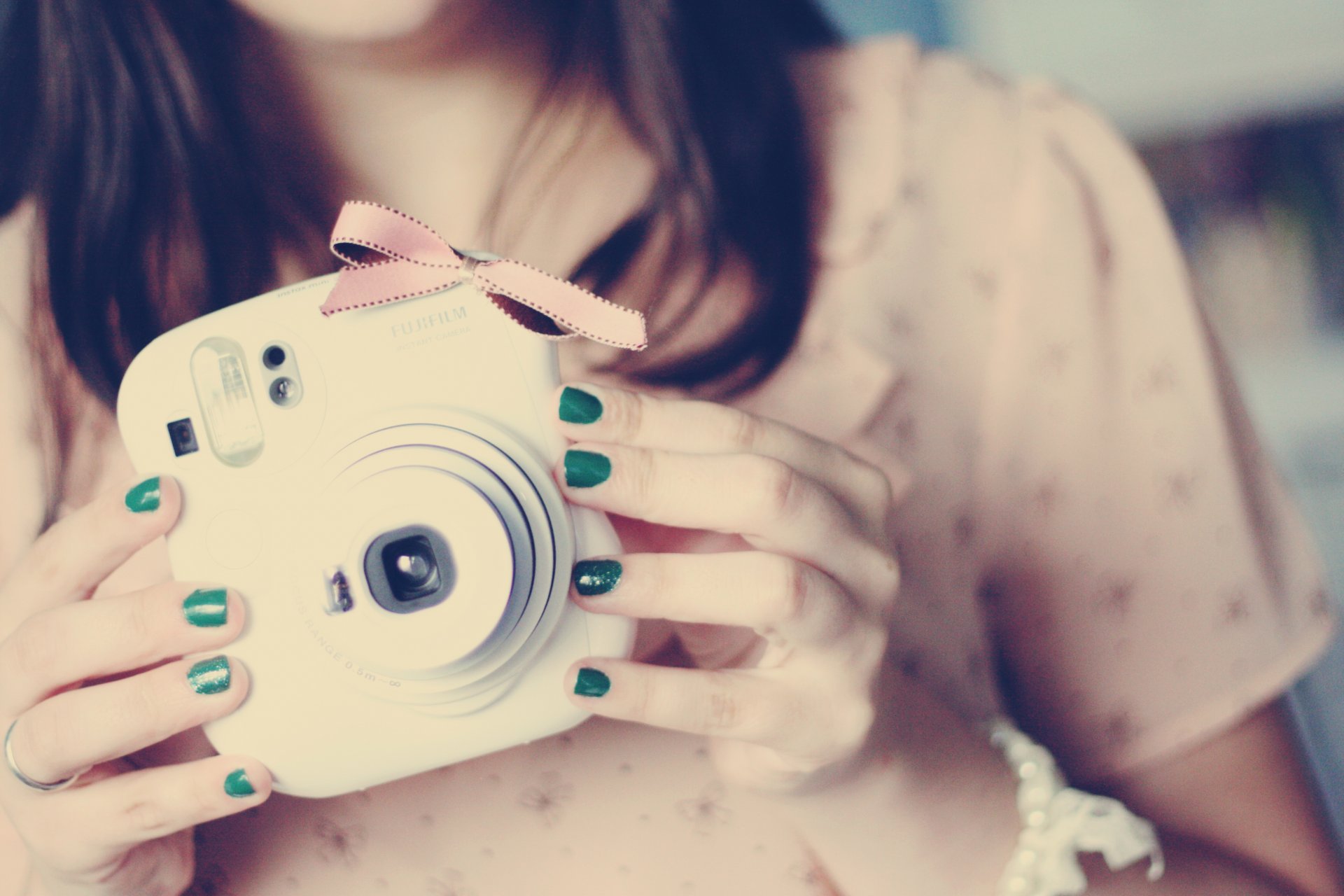 Appareil photo dans les mains de la jeune fille avec des ongles verts