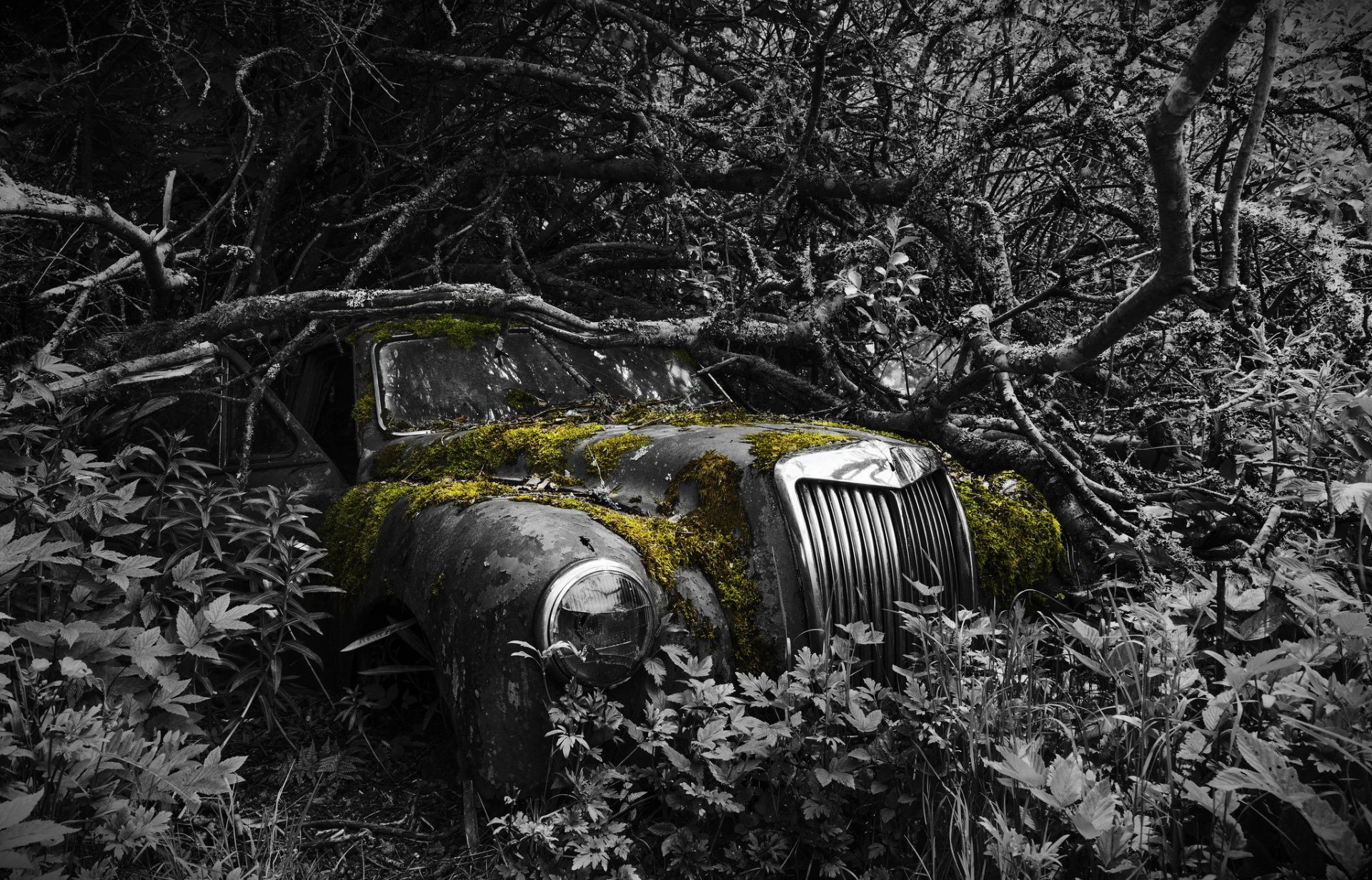 Vieille femme oubliée couverte de mousse