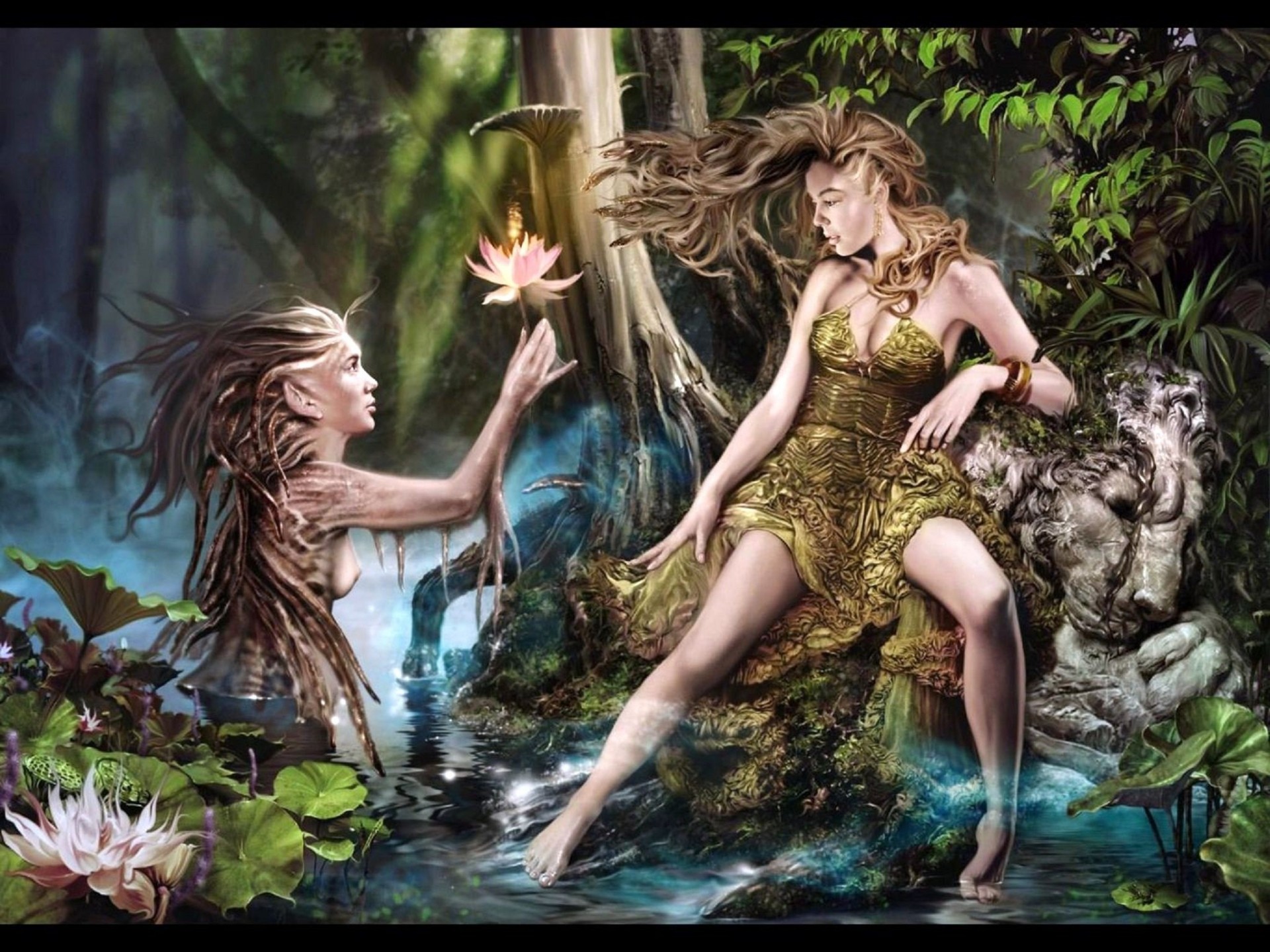 Deux filles dans la rivière avec un nénuphar dans les mainsDeux filles dans la rivière avec un nénuphar dans les mains