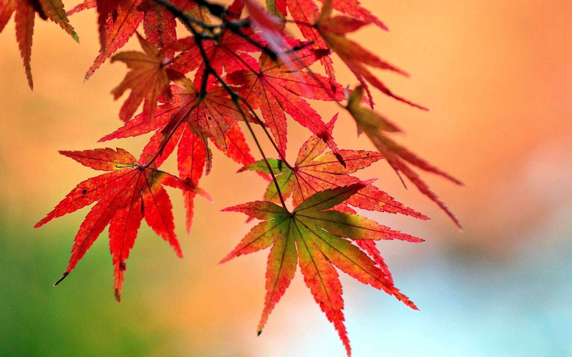 Jeune fille dans une robe rouge avec des cheveux jaunes près d'un arbre avec un feuillage rouge vif entouré de bois gris sombre