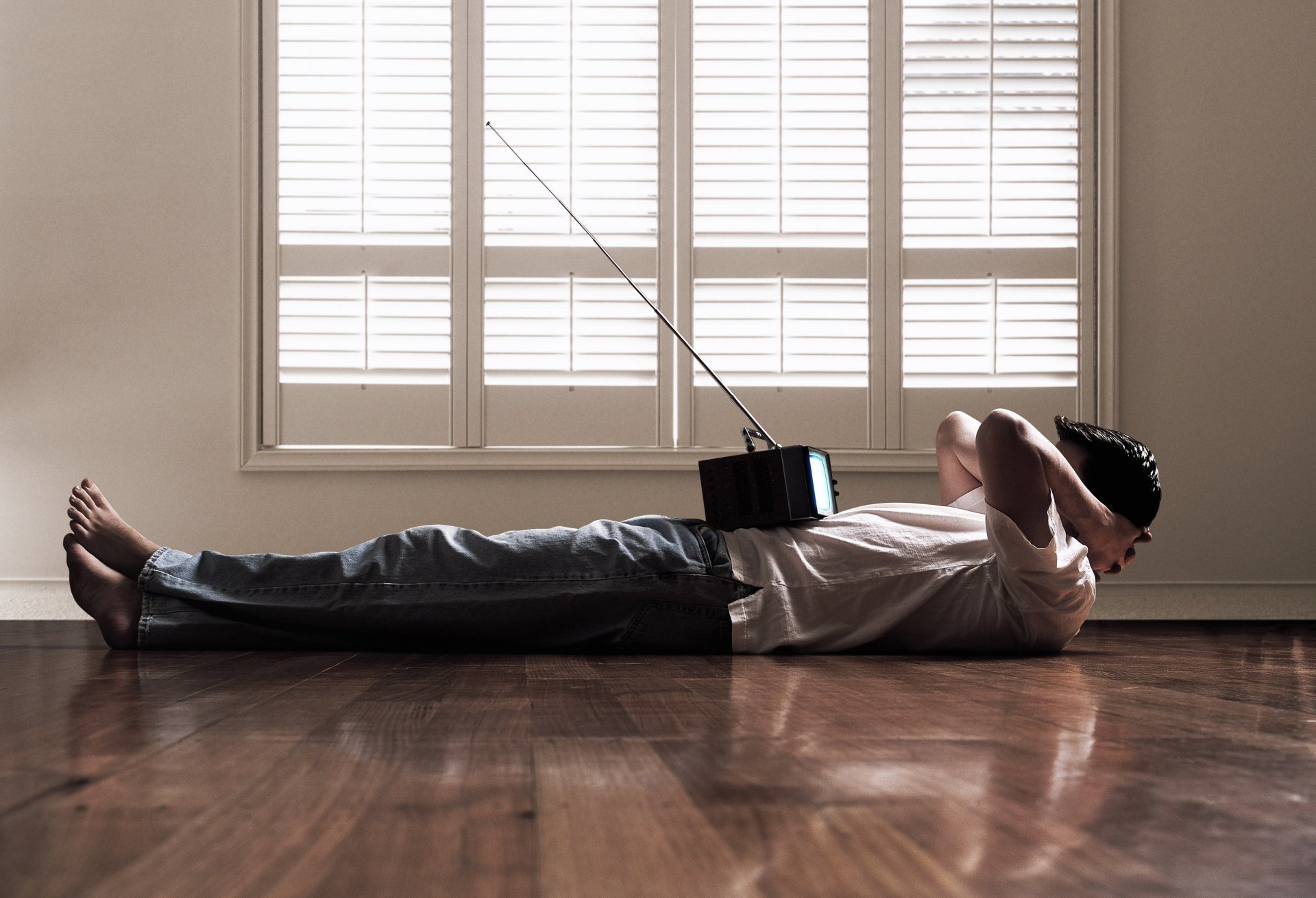 Un homme allongé sur le sol à regarder la télévisionUn homme allongé sur le sol à regarder la télévision