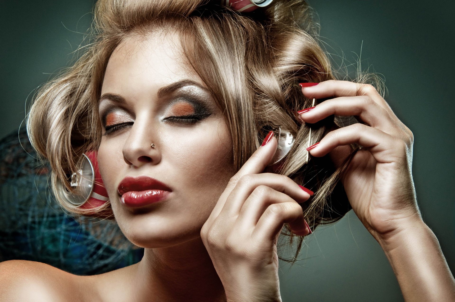 Fille avec piercing avec maquillage brillant et bigoudisFille avec piercing avec maquillage brillant et bigoudis