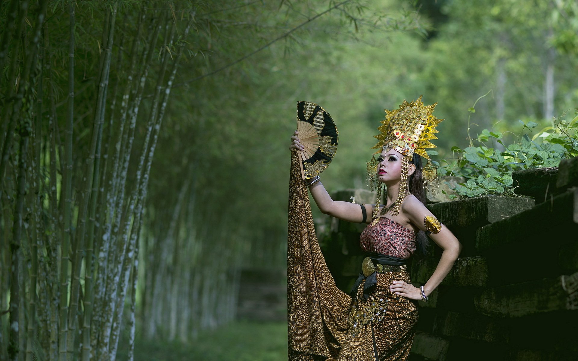Belle fille avec un ventilateur sur fond d'arbres vertsBelle fille avec un ventilateur sur fond d'arbres verts