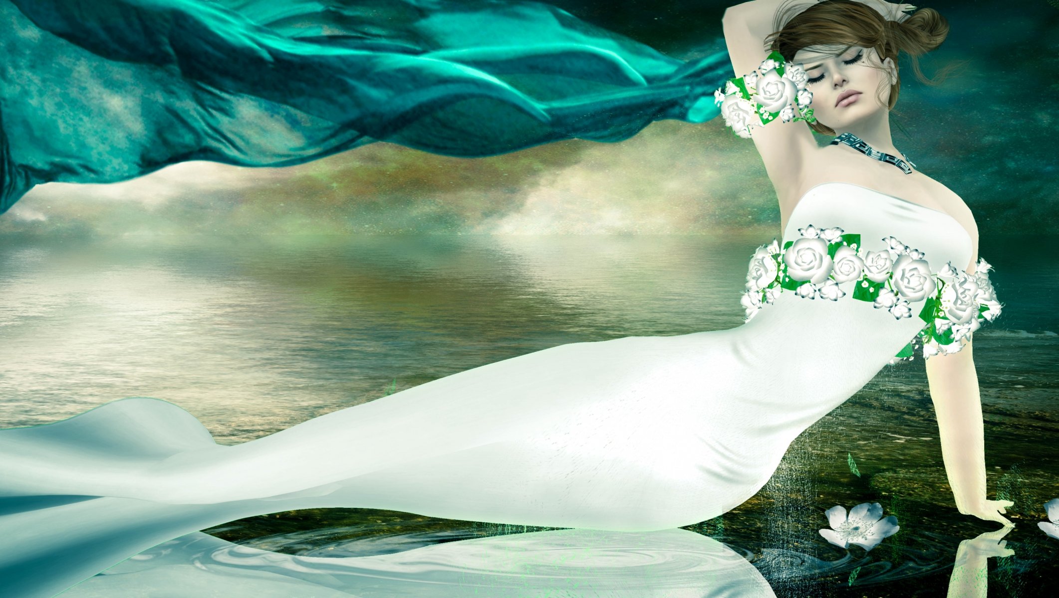 La jeune fille en 3d, debout dans l'eau et tient dans ses mains une épée