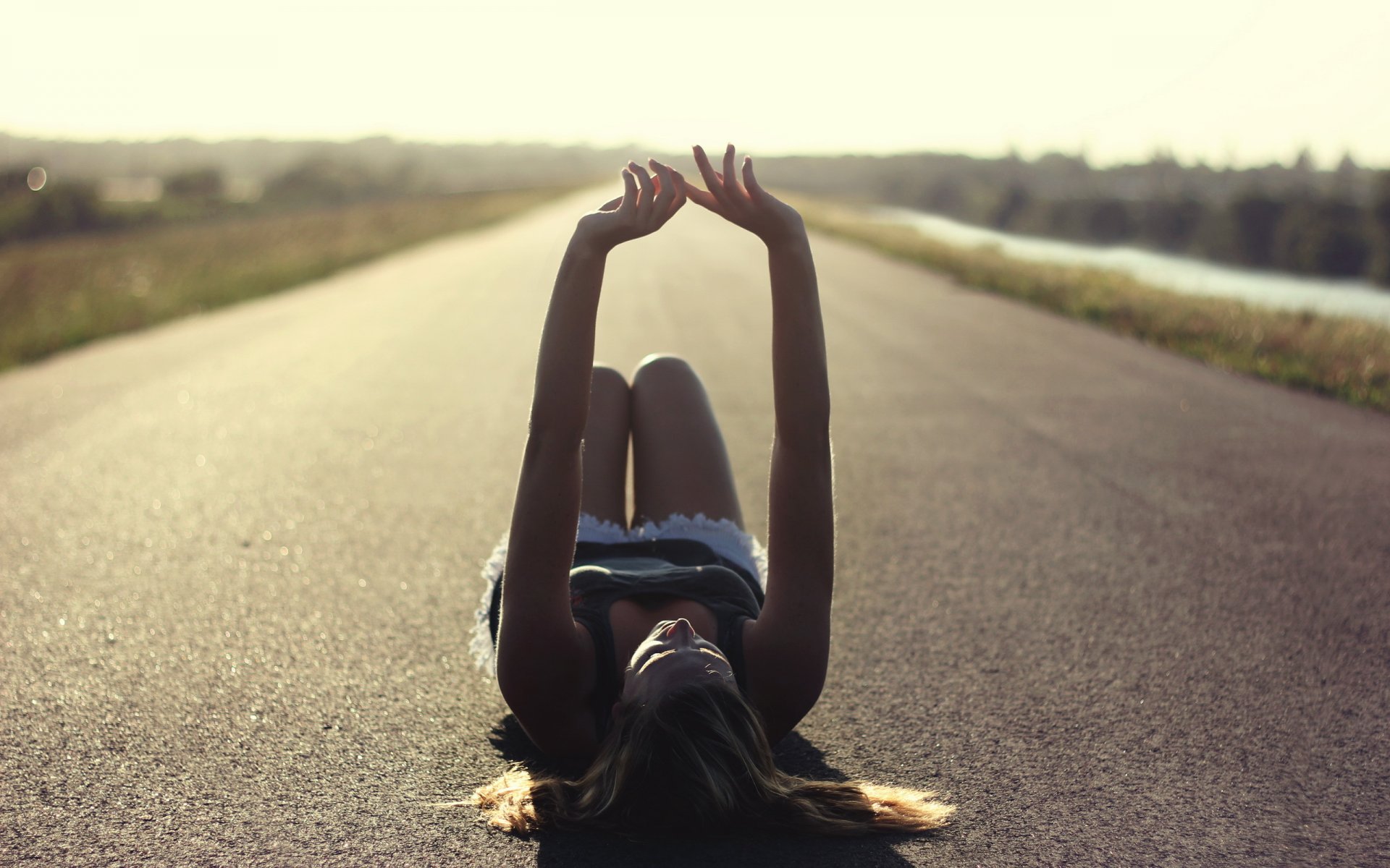 La jeune fille se trouve sur la route au milieu des pétales de fleurs
