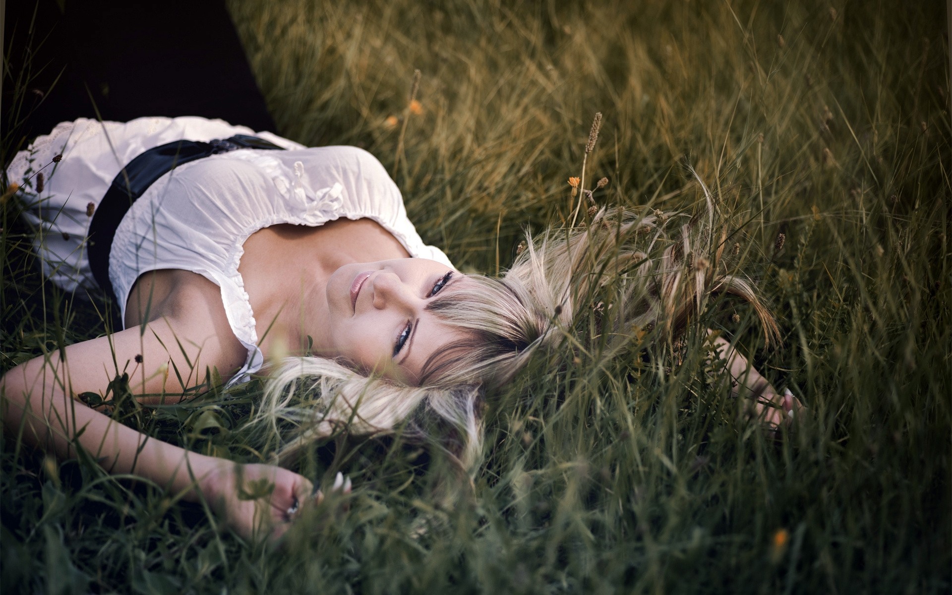 La jeune fille se trouve sur l'herbe à la lumière de la nuit.