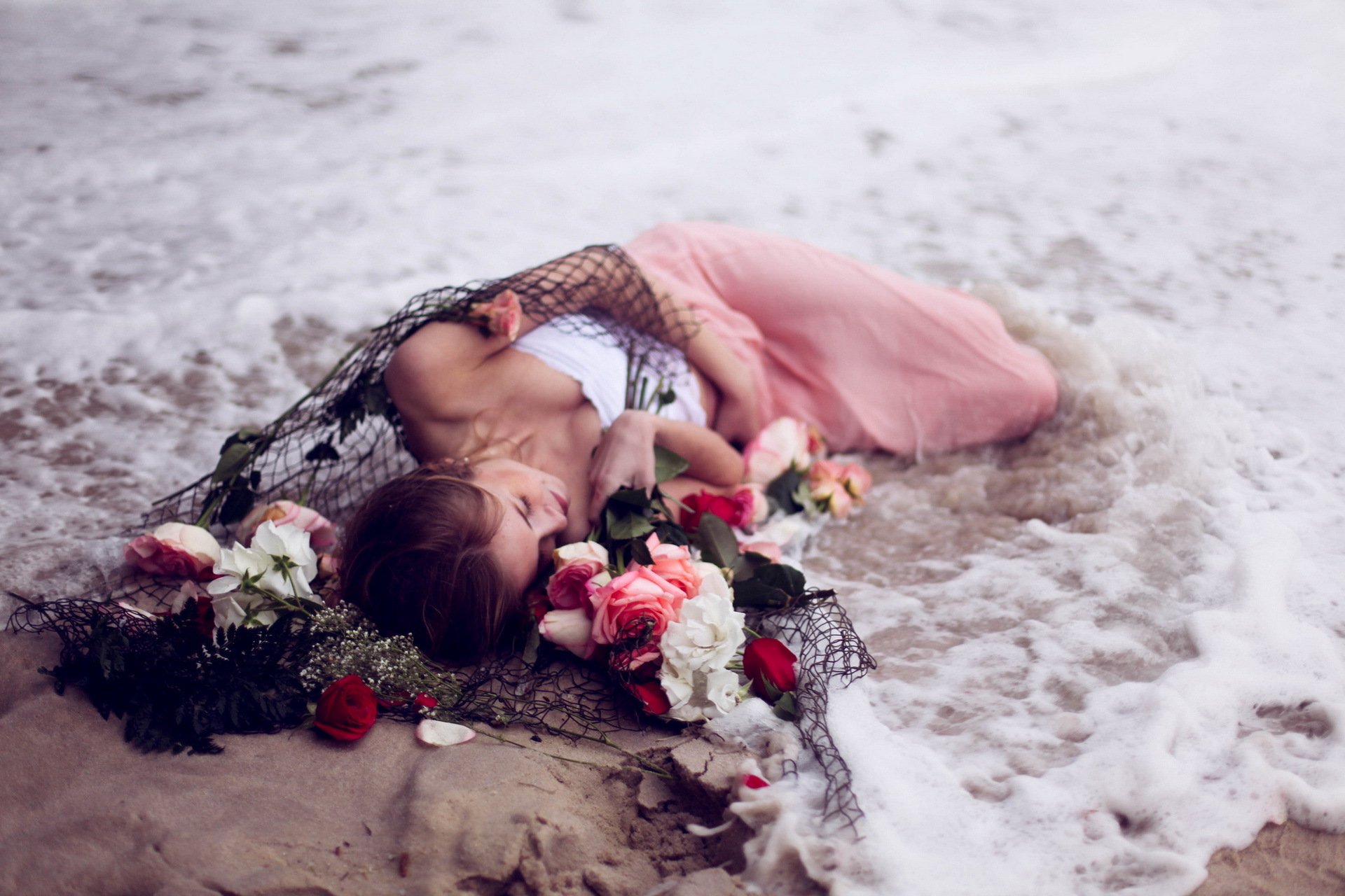 Fantaisie. Jeune fille se trouve sur la pierre près de la cascade