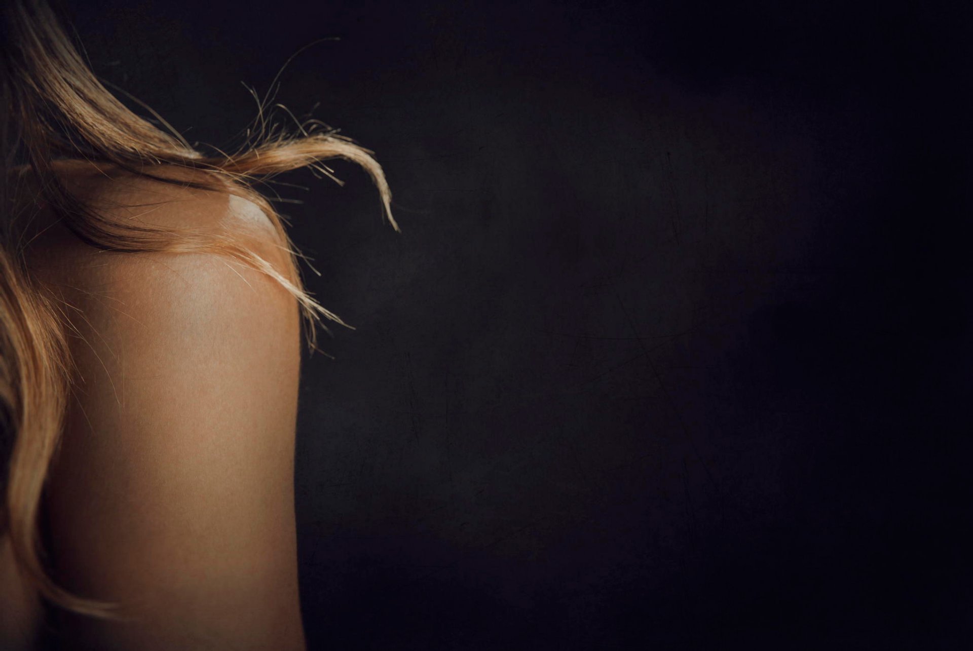 Boucles blondes sur l'épaule d'une jeune fille. Fond sombre