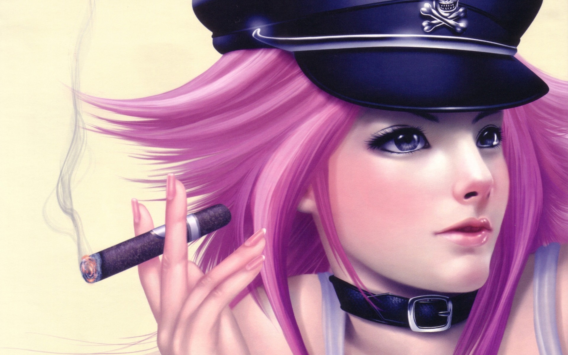 Dessin d'une fille fumante avec des cheveux violetsDessin d'une fille fumante avec des cheveux violets