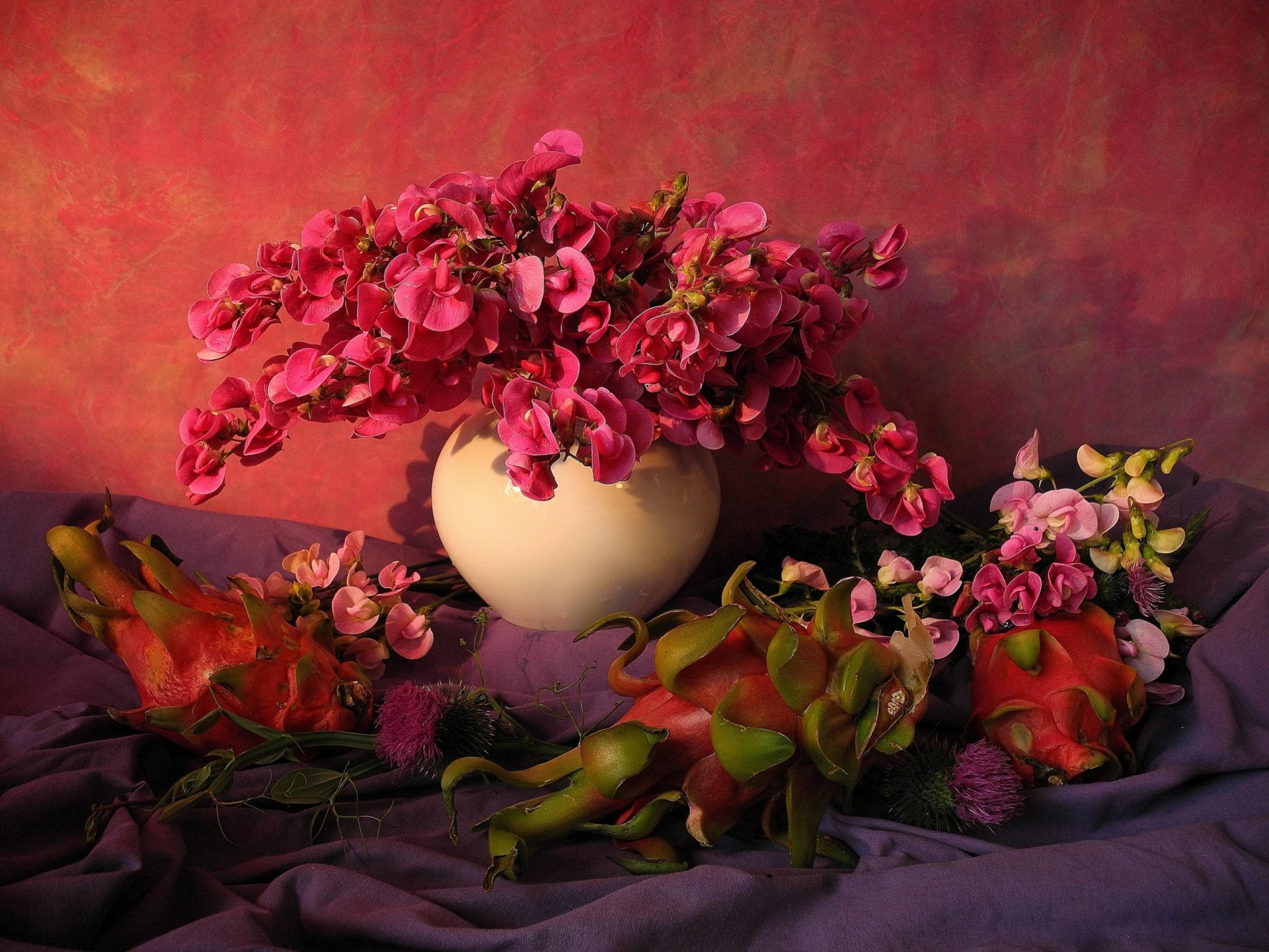 Nature morte avec des fruits et des fleurs sur fond rouge