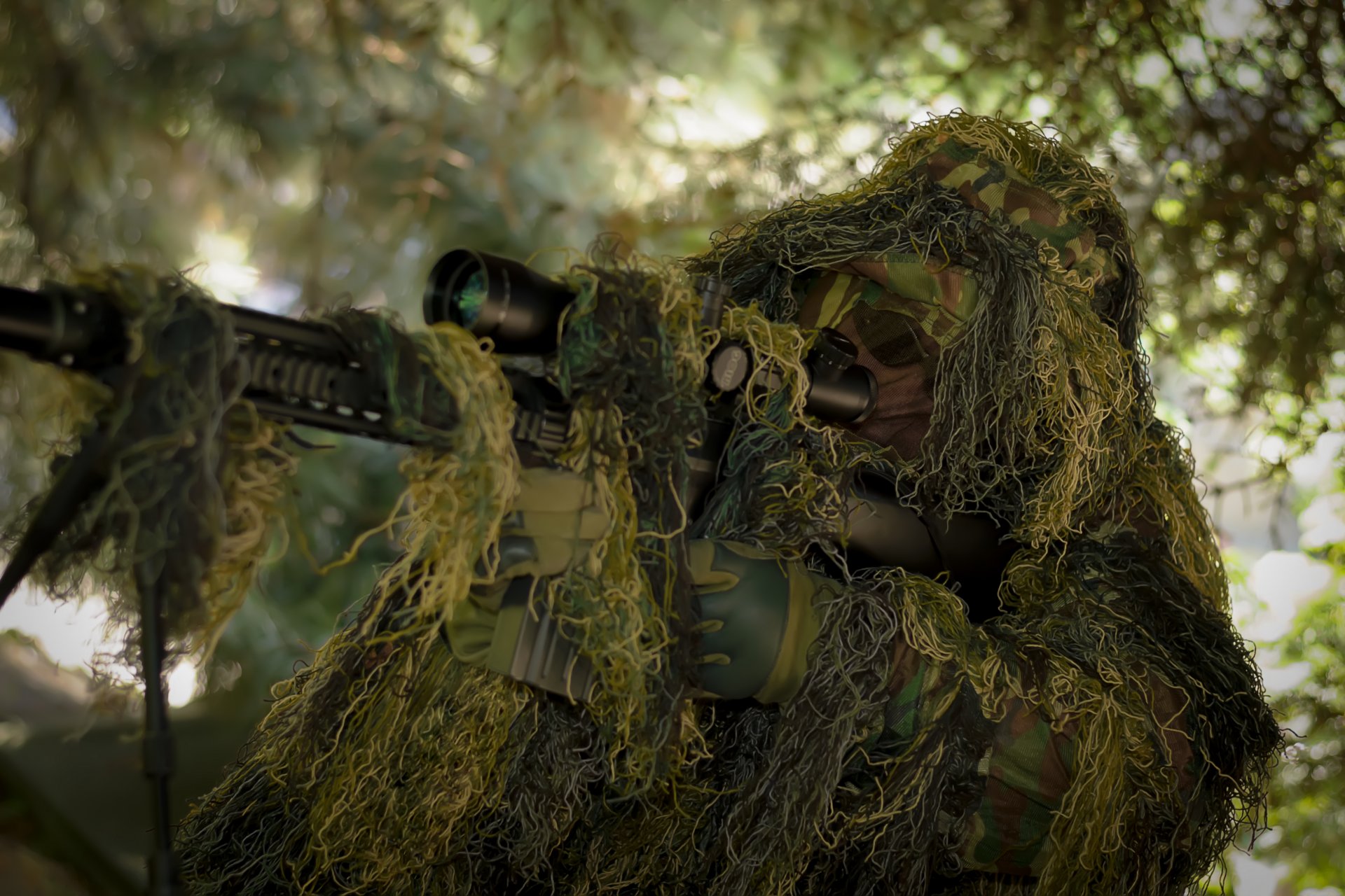 Sniper avec un fusil déguisé en vert