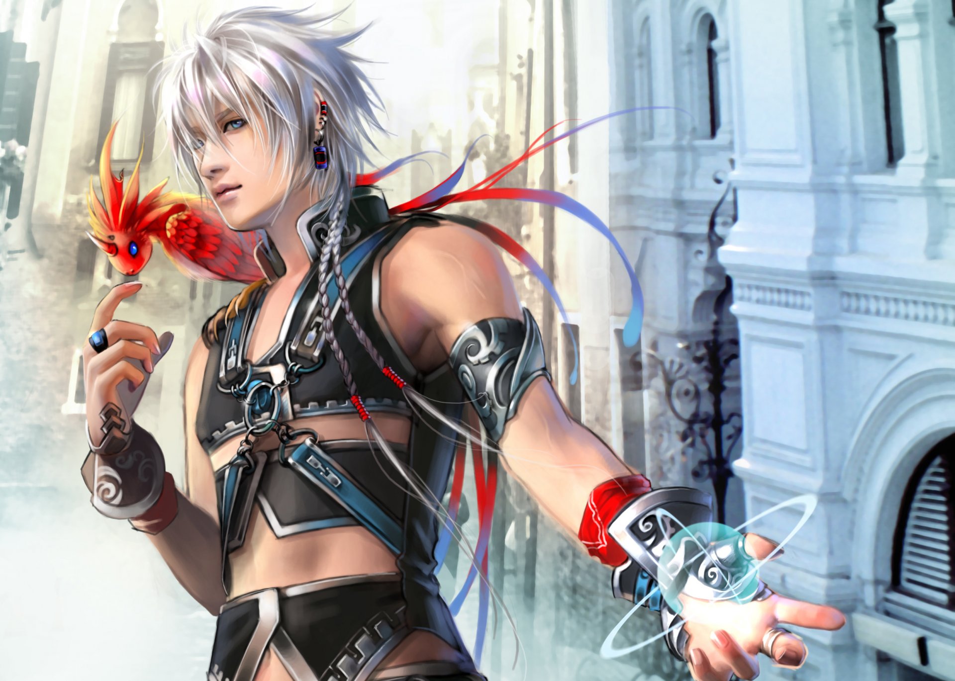 Un gars qui a de la magie avec un oiseau sur son épaule