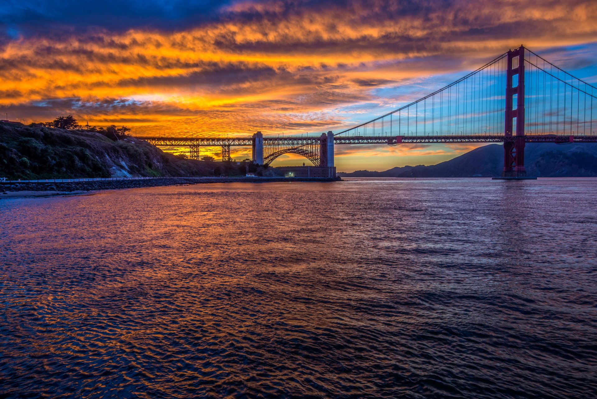 Golden gate bridge à san francisco, à marée haute, dans les tons bleu-lilasGolden Gate Bridge à San Francisco, à marée haute, dans les tons bleu-lilas