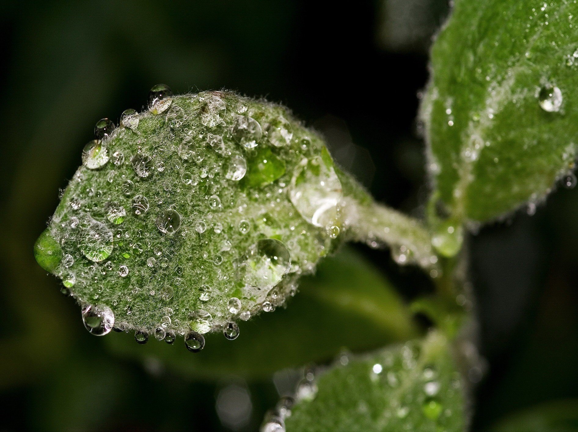 Gouttes d'eau sur une feuille pelucheuse