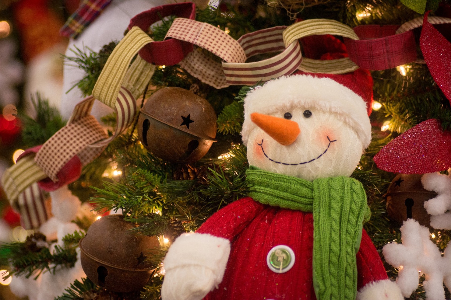 Bonhomme de neige sur fond d'arbre de noël avec des jouetsBonhomme de neige sur fond d'arbre de Noël avec des jouets
