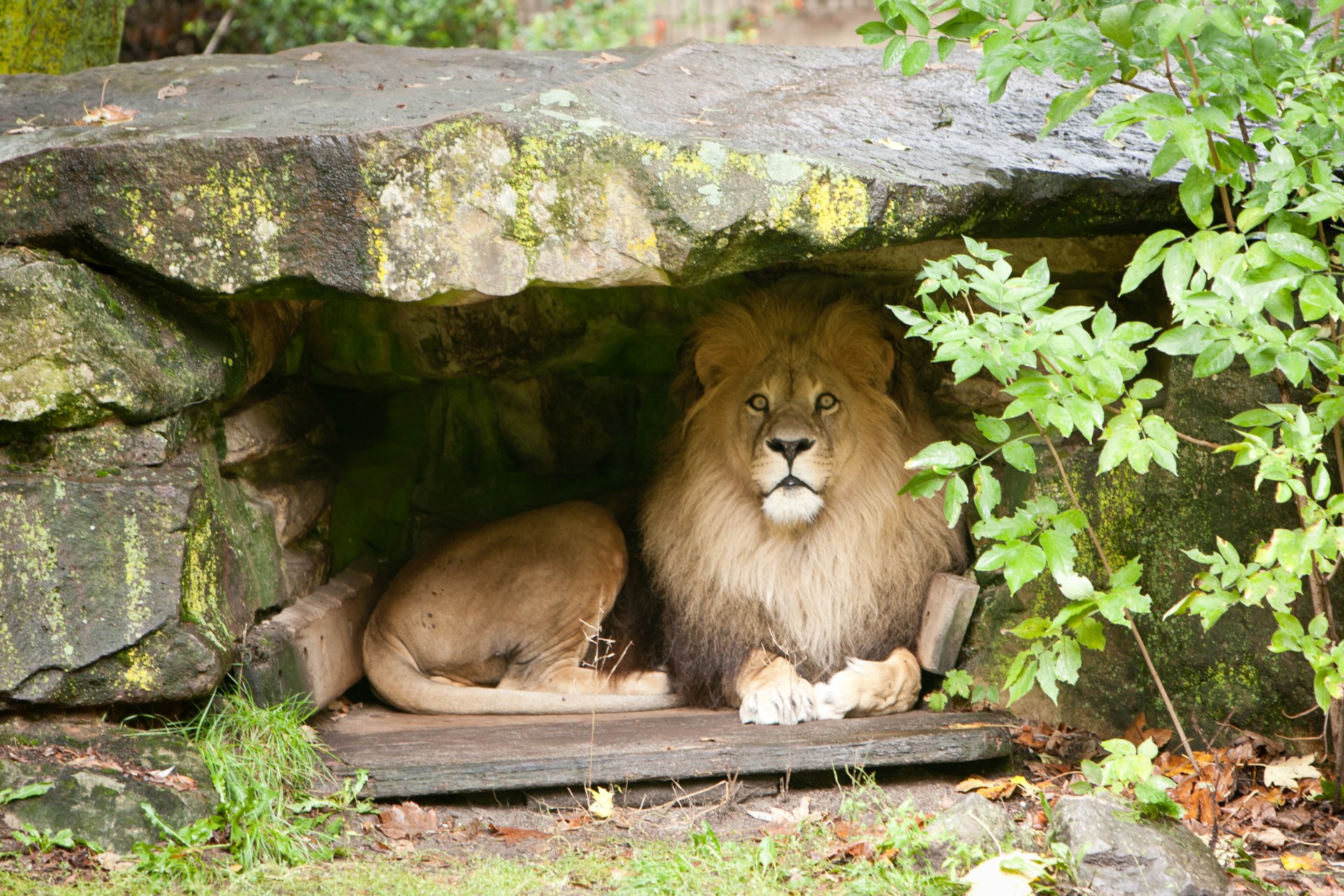 Un Lion avec une crinière luxueuse se trouve sous une pierre dans une grotte