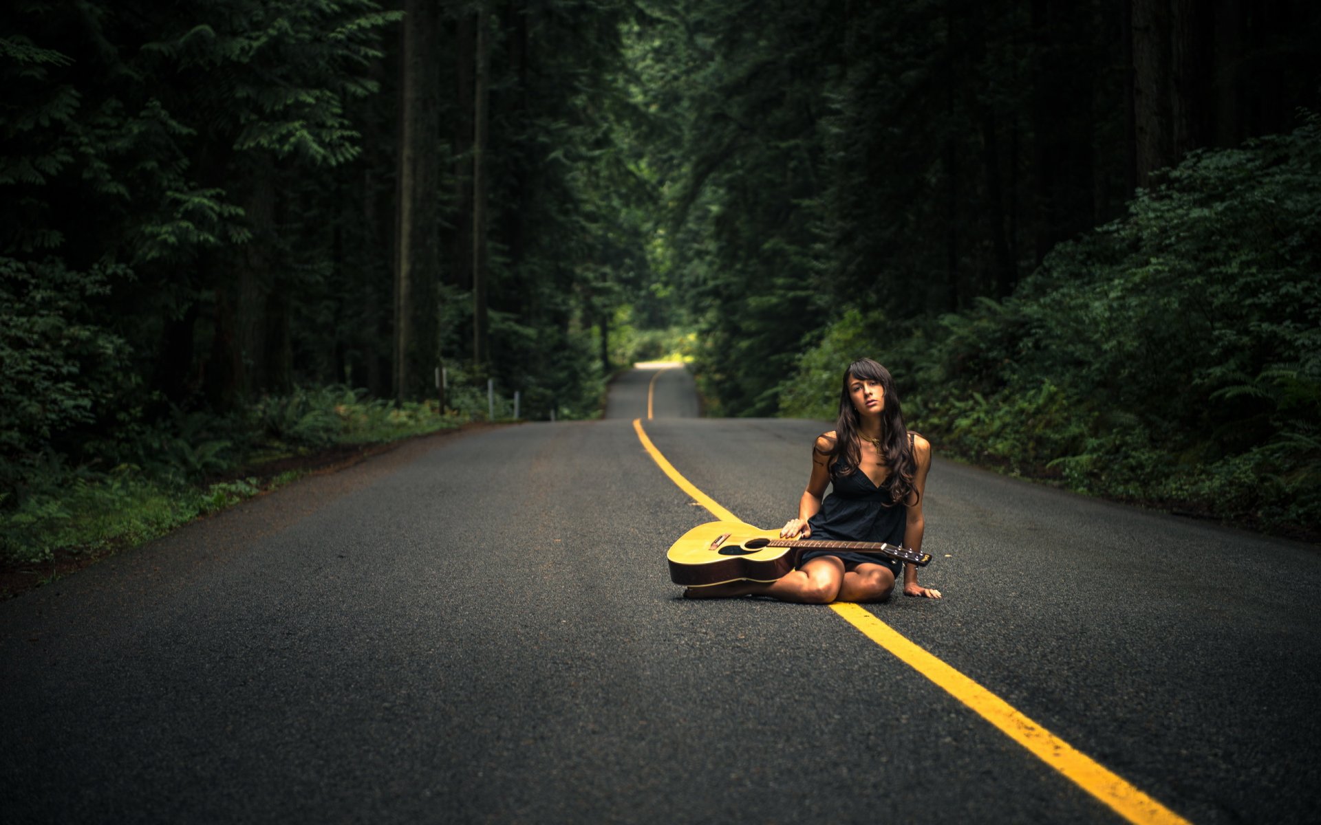 Fille avec une guitare sur la route