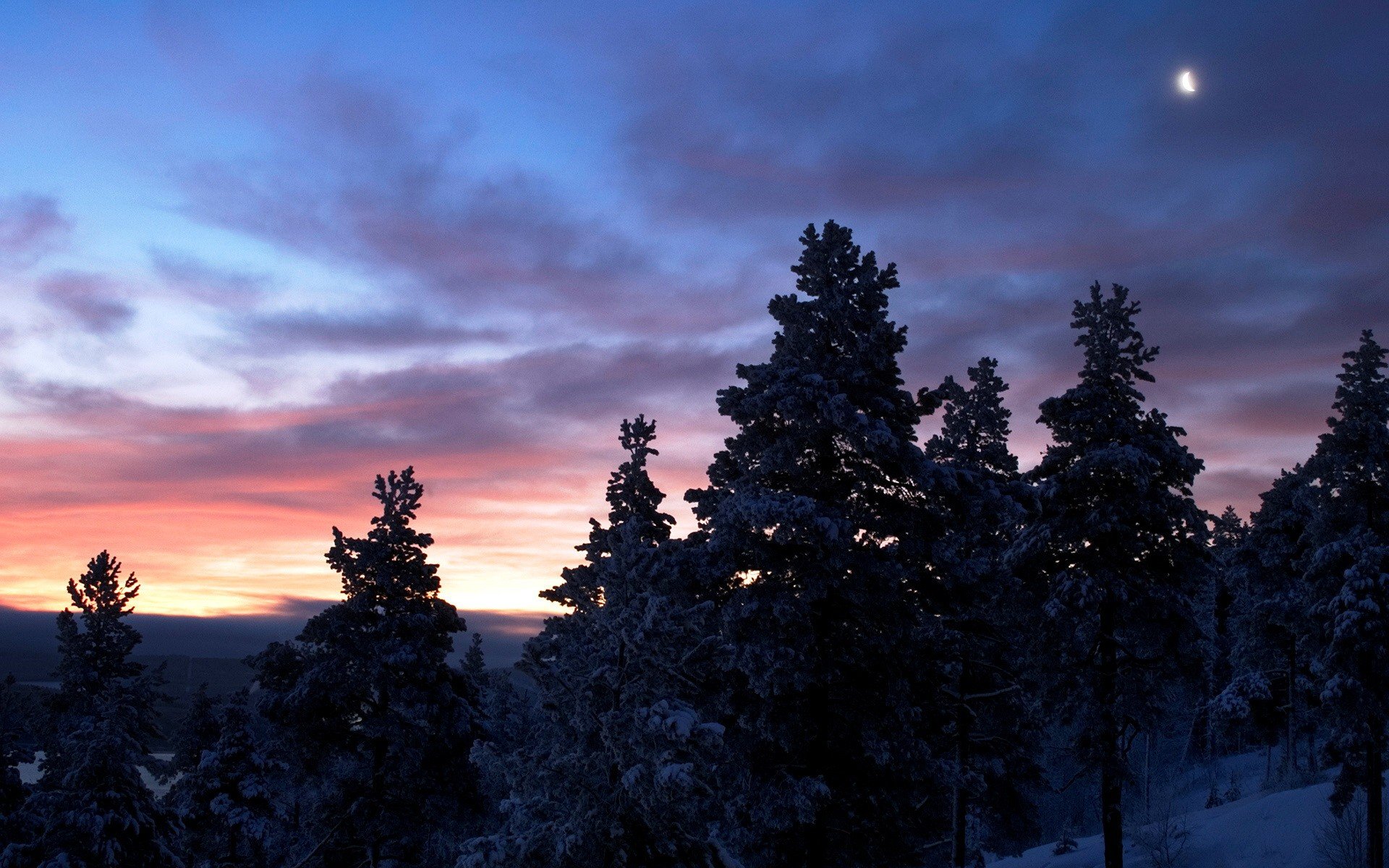 Route d'hiver dans les sapins enneigés à pleine luneRoute d'hiver dans les sapins enneigés à pleine lune
