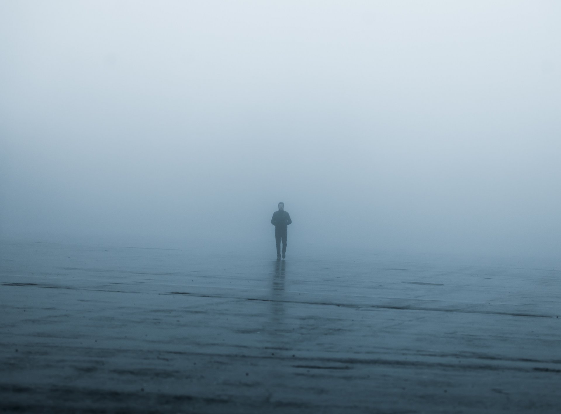 Homme solitaire en noir assis sur un banc au bord de la mer