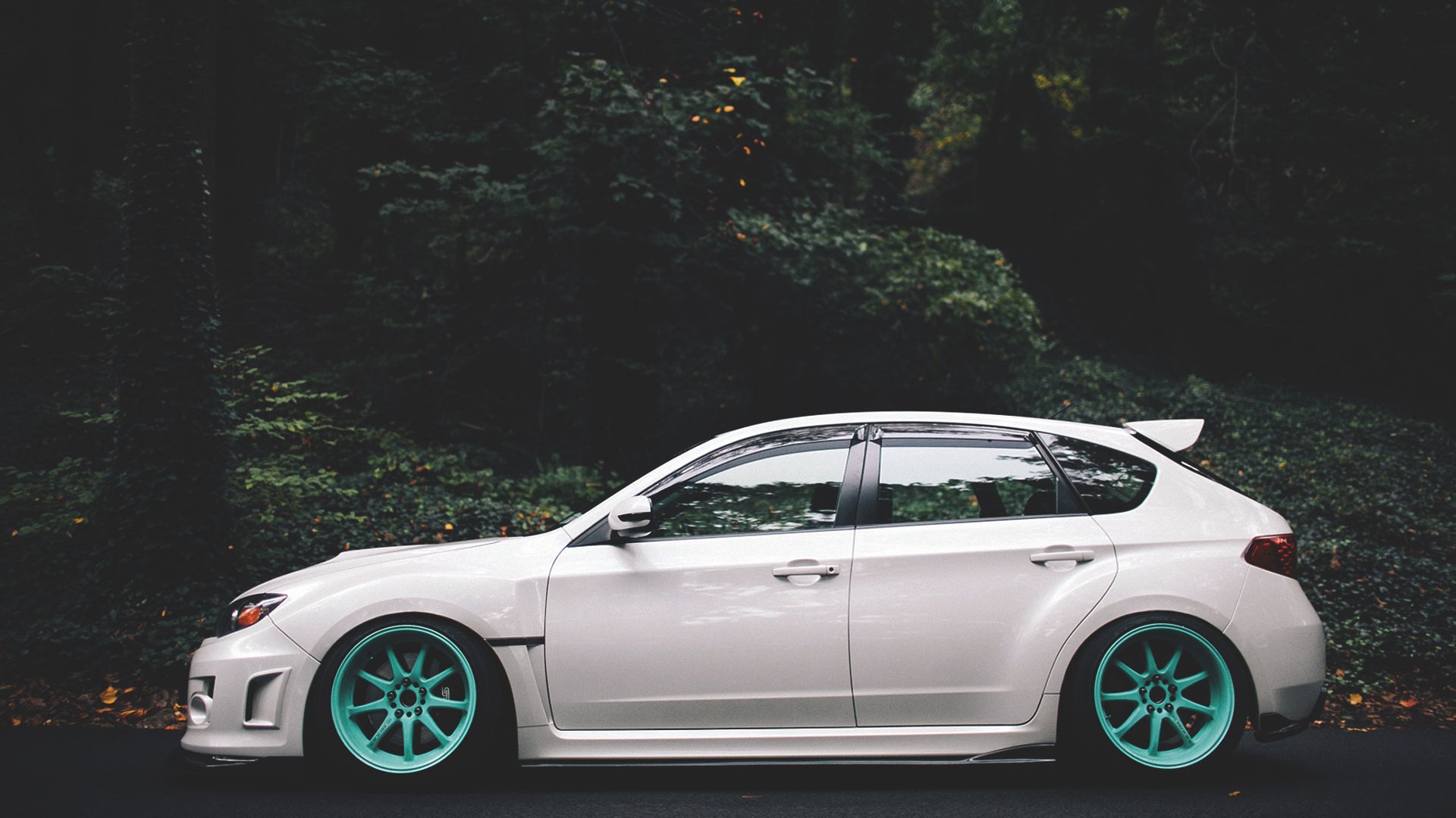 Subaru Impreza blanc avec disques turquoise