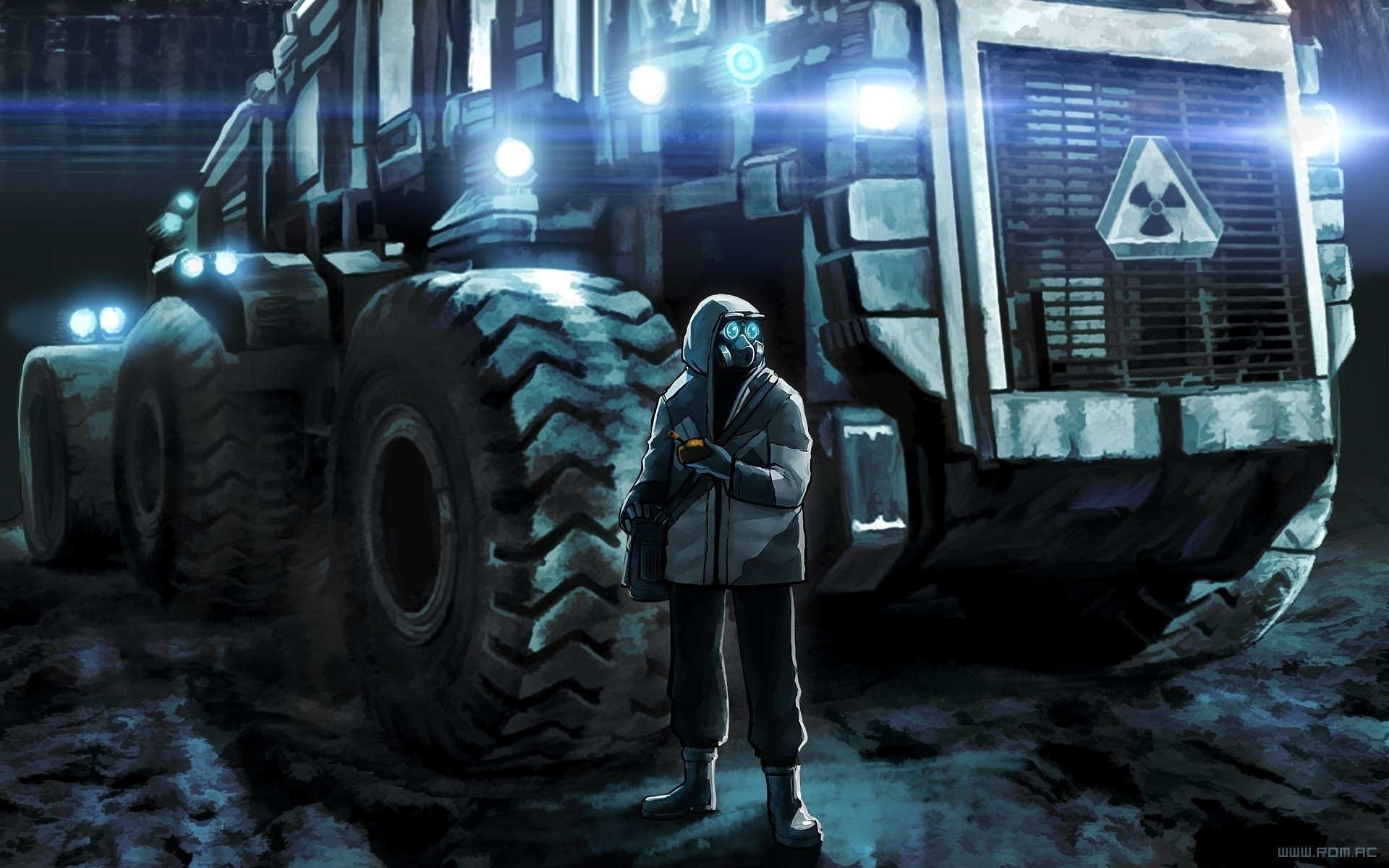 Bande dessinée apocalyptique. un héros dans un respirateur se tient devant une grande voitureBande dessinée apocalyptique. Un héros dans un respirateur se tient devant une grande voiture