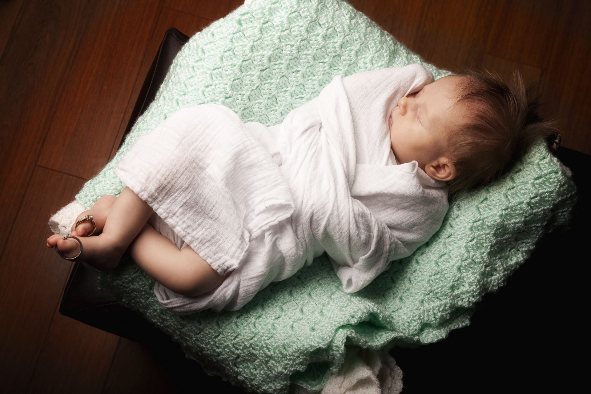 Bébé dort dans une couche avec des anneaux sur les jambes