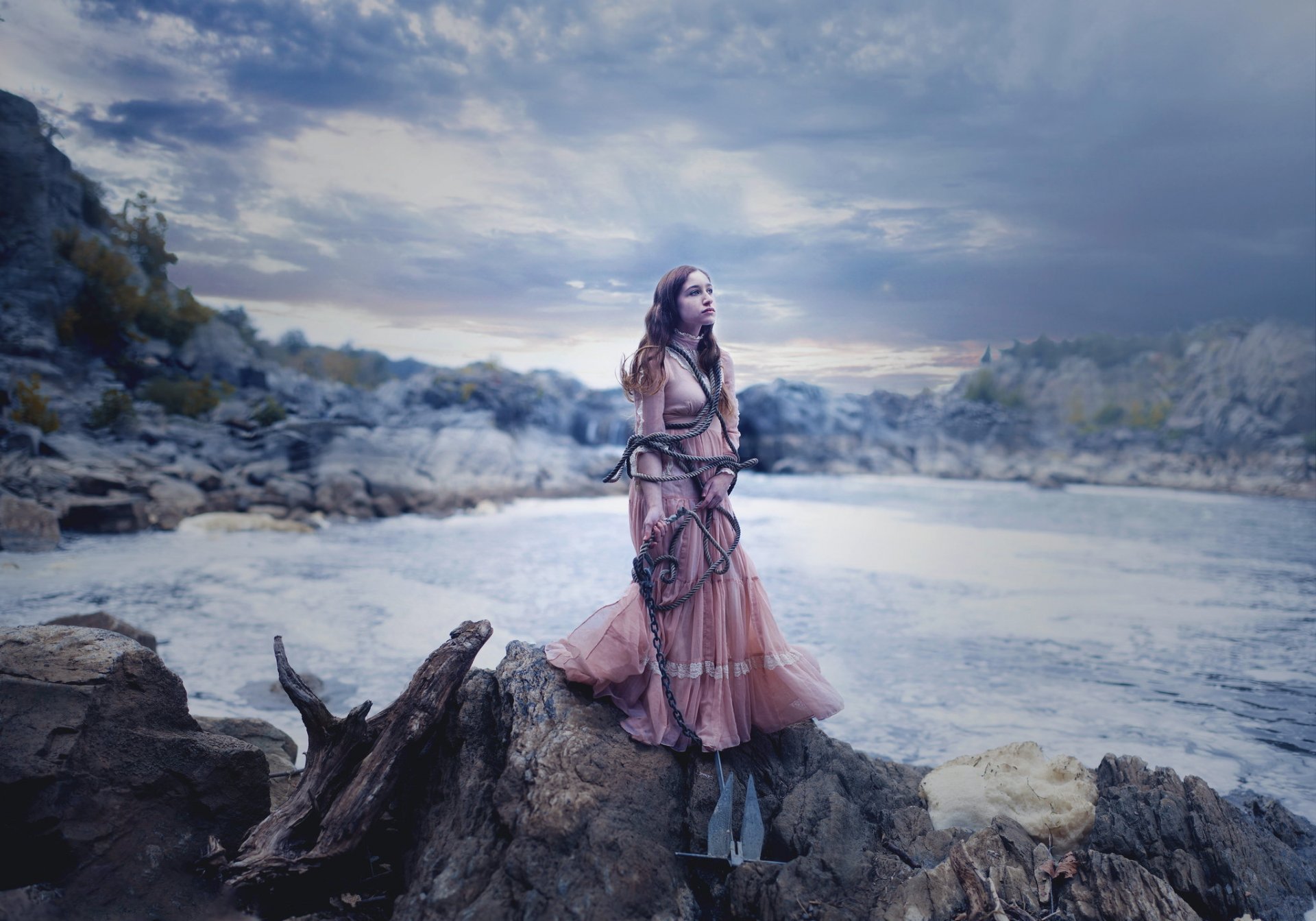 La jeune fille en robe blanche se trouve dans la rivièreLa jeune fille en robe blanche se trouve dans la rivière