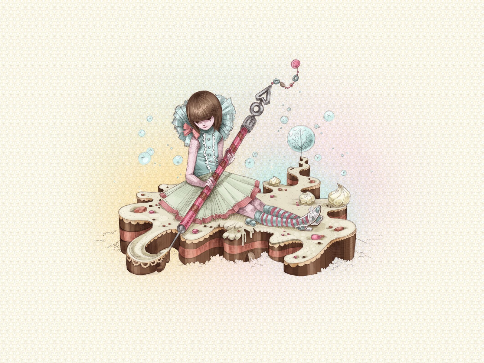 Sur un fond beige, une fille est assise sur un gâteauSur un fond beige, une fille est assise sur un gâteau