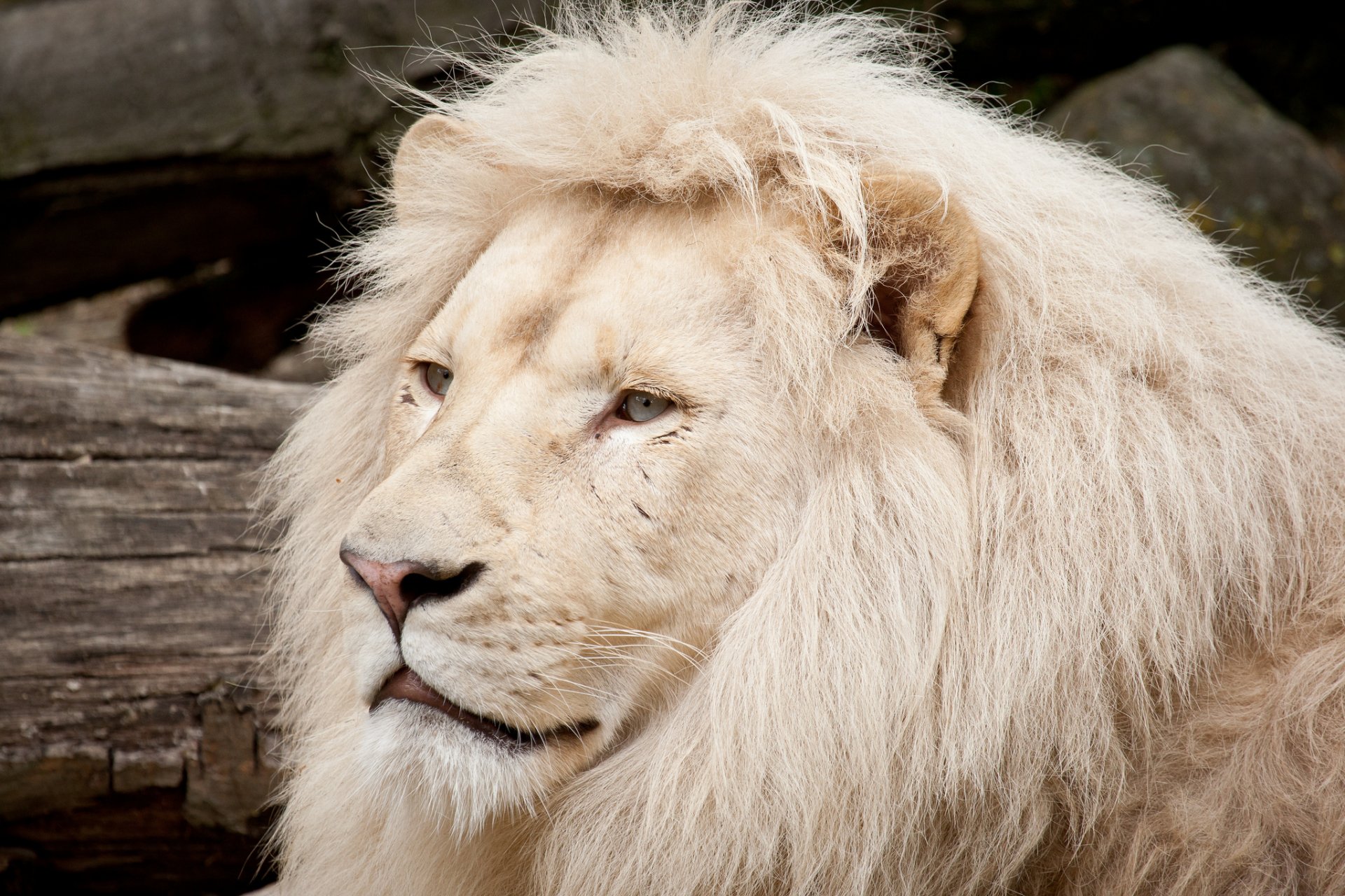 Lion albinos avec une crinière luxueuse et des yeux clairsLion albinos avec une crinière luxueuse et des yeux clairs