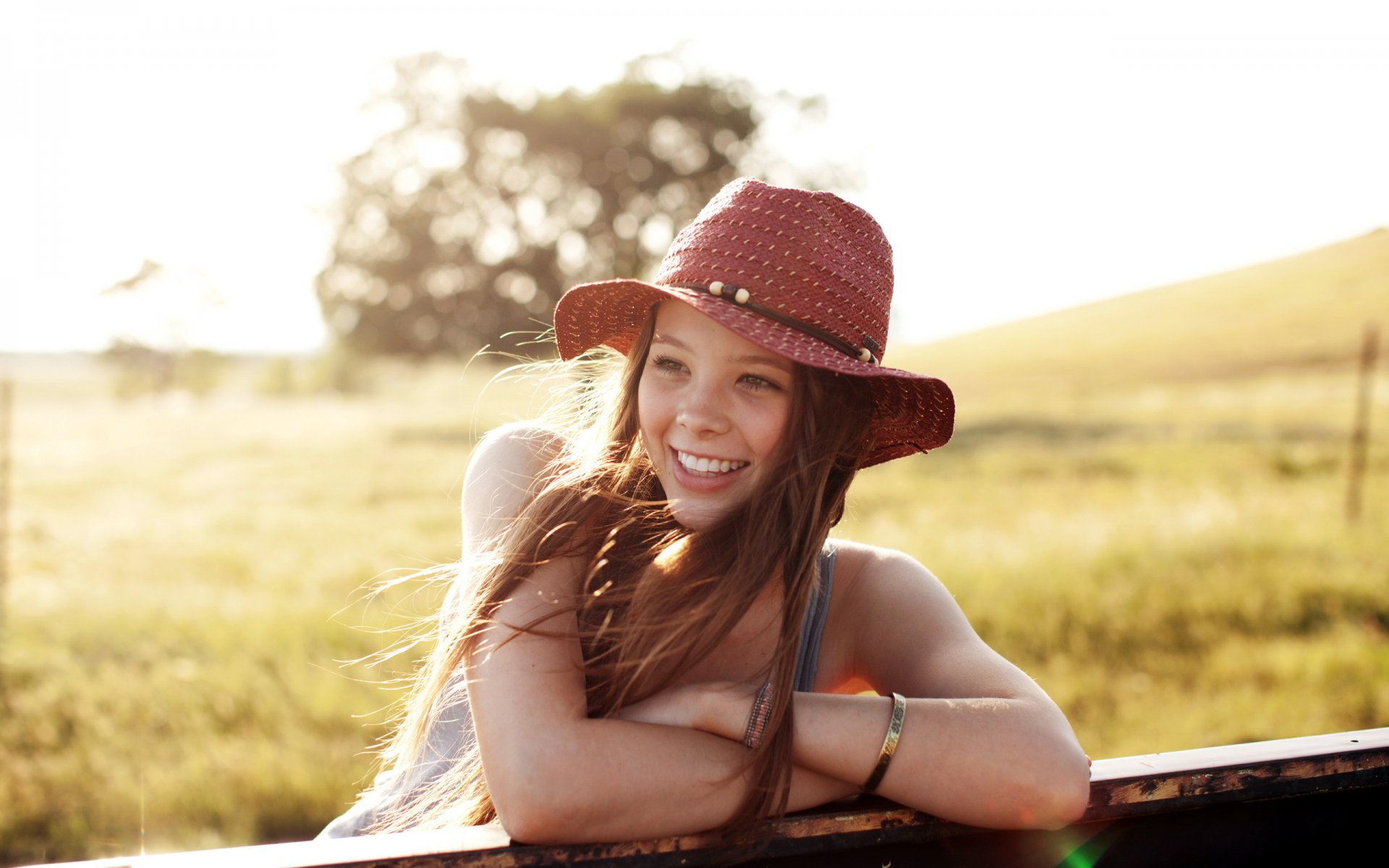 La jeune fille dans le chapeau de l'après-midi d'été de sourireLa jeune fille dans le chapeau de l'après-midi d'été de sourire