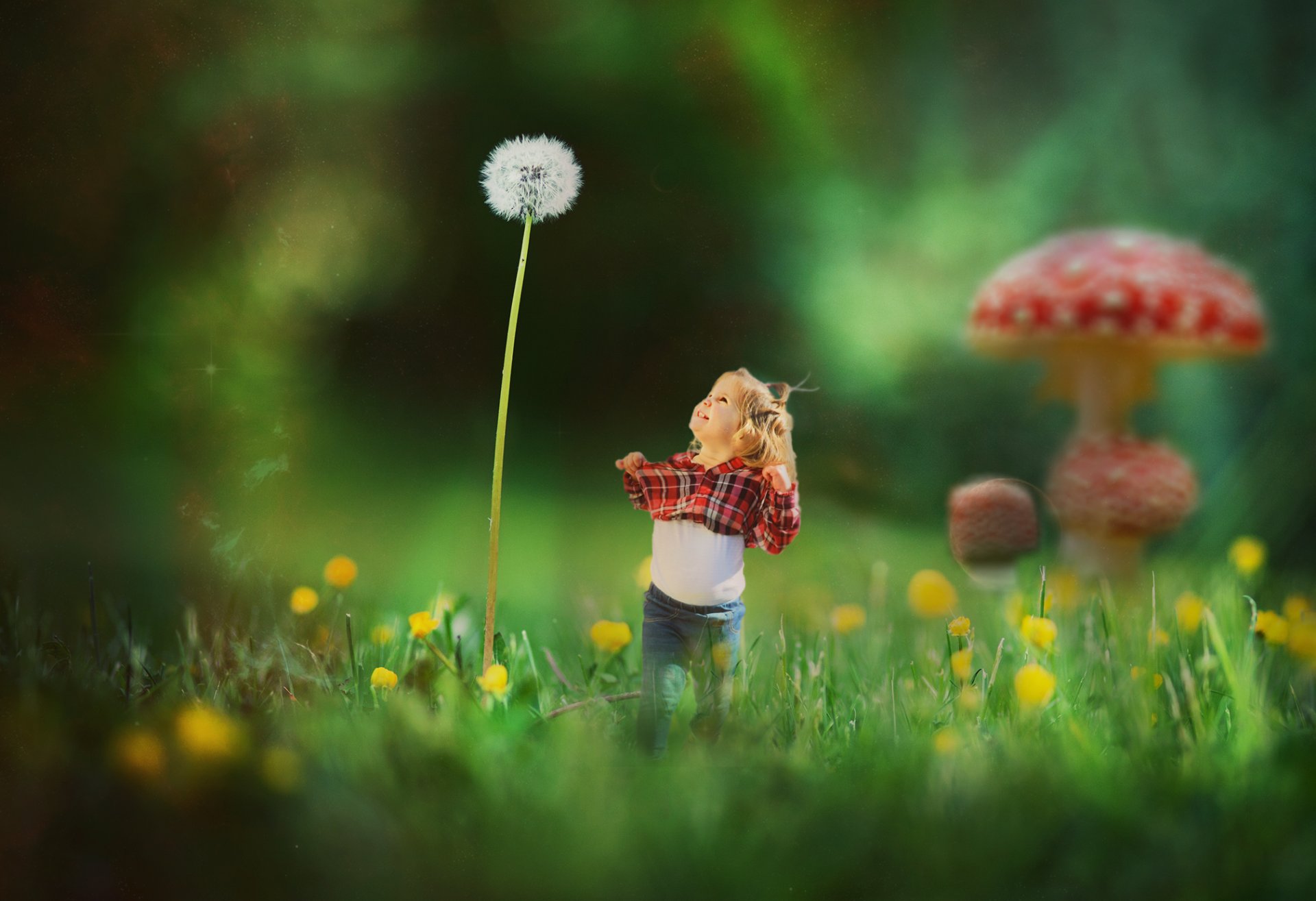 Une petite fille et un énorme pissenlit sur la clairièreUne petite fille et un énorme pissenlit sur la clairière