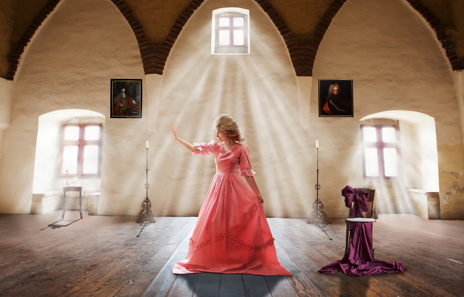 Fille en robe rouge dans la salle, image dans le style de la renaissanceFille en robe rouge dans la salle, image dans le style de la Renaissance